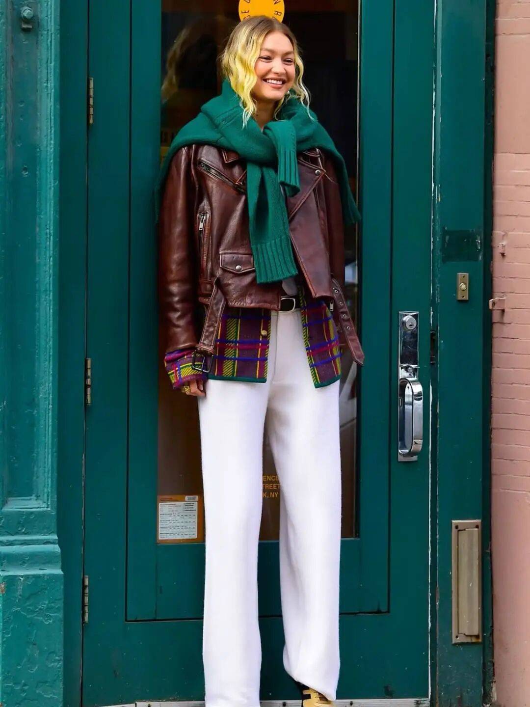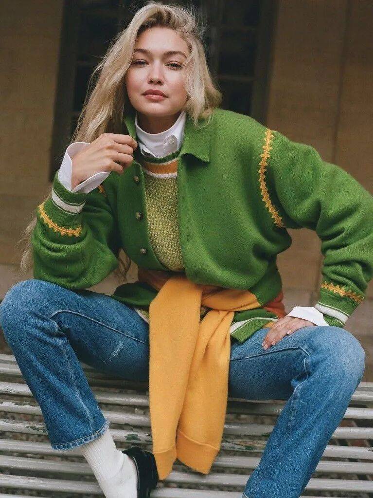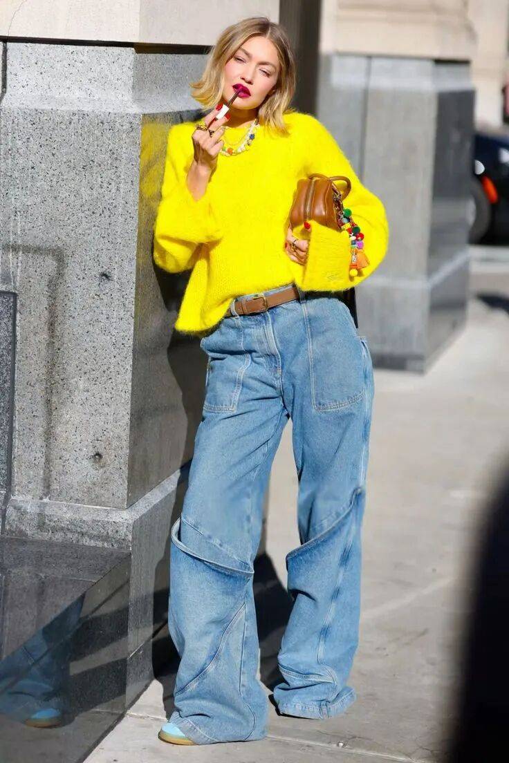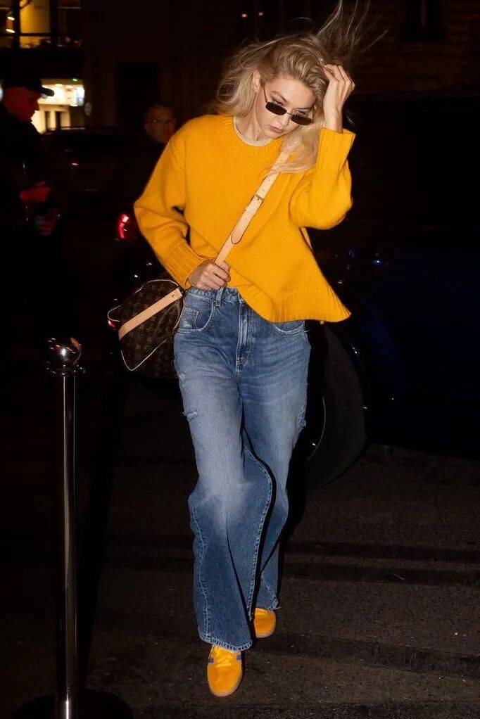 Gigi Hadid就有过橘色、黄色的毛衣look,搭配牛仔裤,休闲随性又吸睛俏皮。