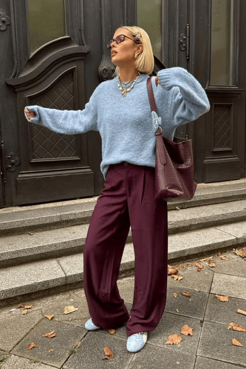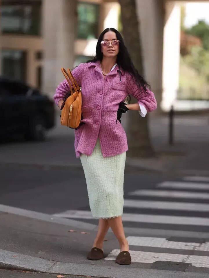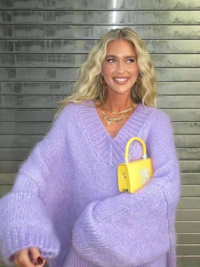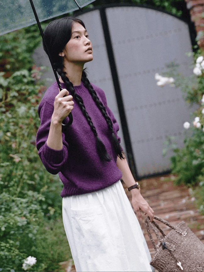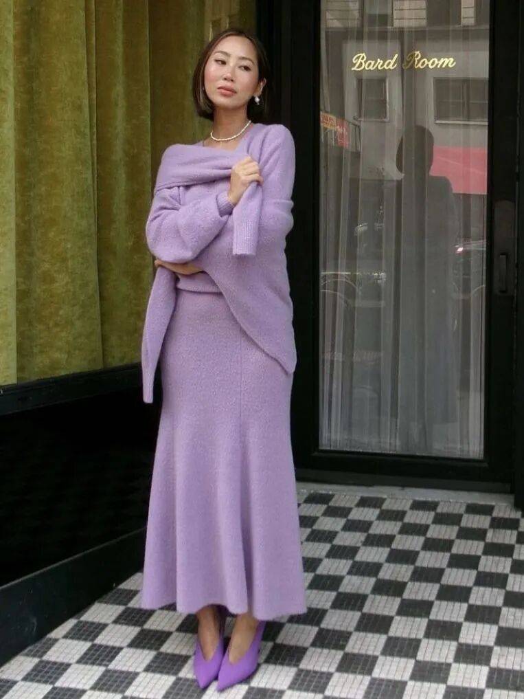 紫色毛衣更有女人味,尤其像淡紫色,哪怕是oversize或全身同色,都能给人一种柔情似水的美。
