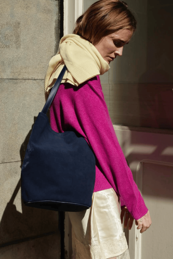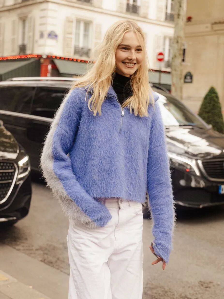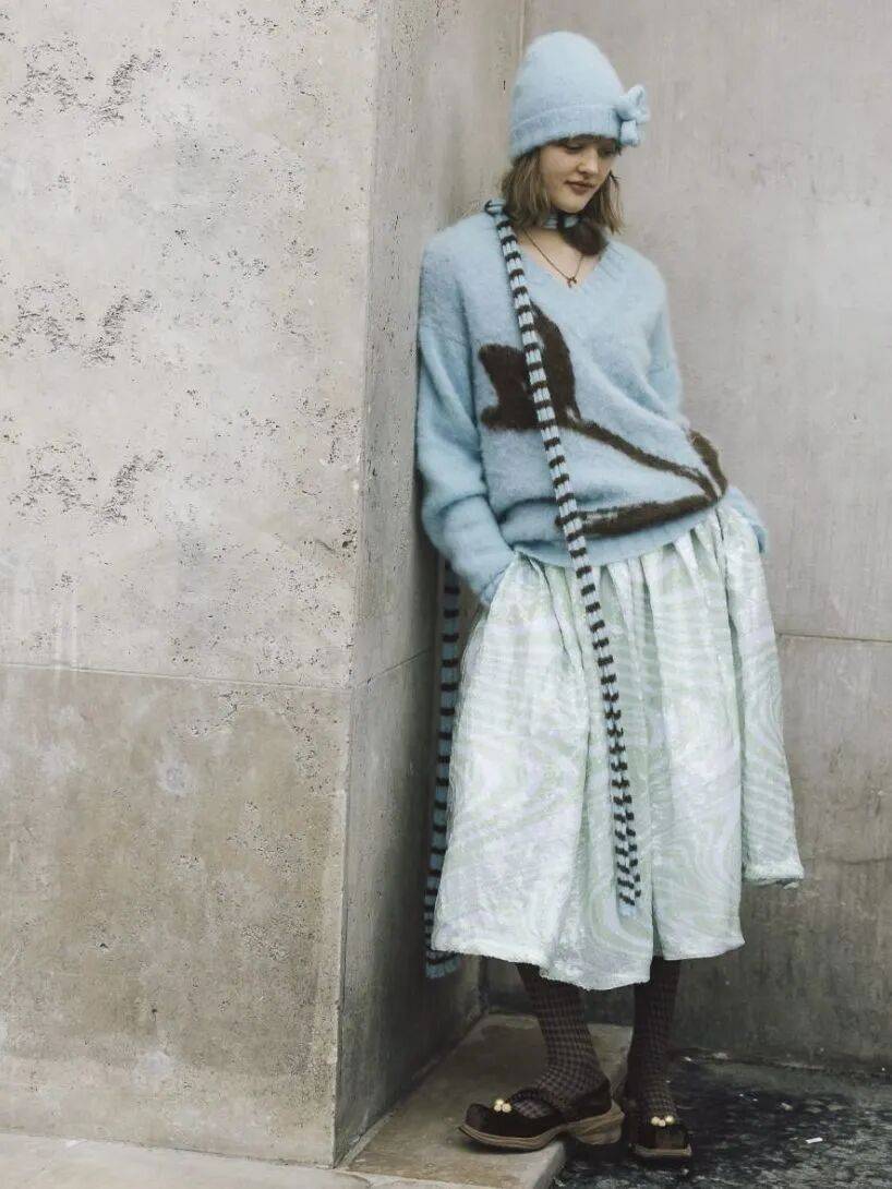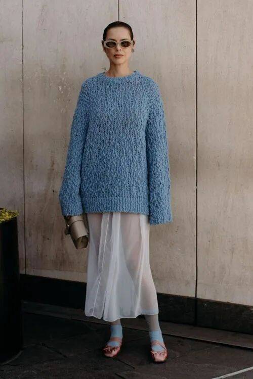 从克莱因蓝到雪山蓝的毛衣,由深至浅,各有其美。搭配也有非常丰富的参考,算是这两年时装周的高频单品了。