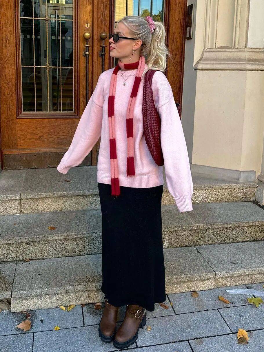 而浅粉色的毛衣,往往更减龄有活力一些。