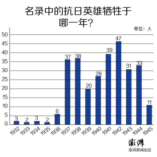 在公布的抗日英烈名录中,牺牲于1942年的人数最多,共有47人。以下是不同年份的阵亡人数统计表: