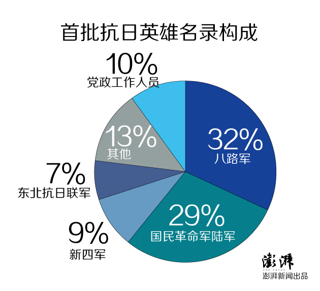 在民政部公布的首批300名著名抗日英烈与英雄群体名录中,属于共产党领导的人数是143人,占名录总人数的48%。其中八路军人数最多,共97人,新四军共26人,东北抗日联军共20人。而国民党方面共有国民革命军陆军87人,占名录总人数的29%。
