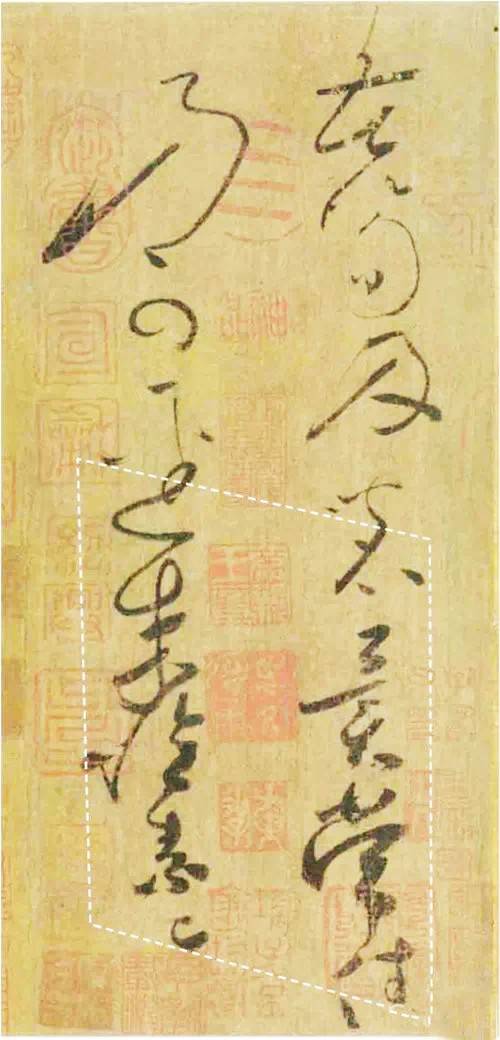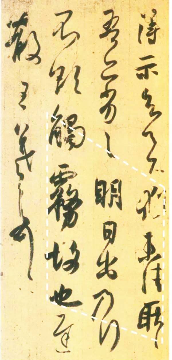 6、怀素的《苦笋贴》,下面一块粗重密集,形成了“实”的感觉。虚实的观察,要概括,从整体上去看、以块面来观察,这样比较容易发现其中的奥妙。
