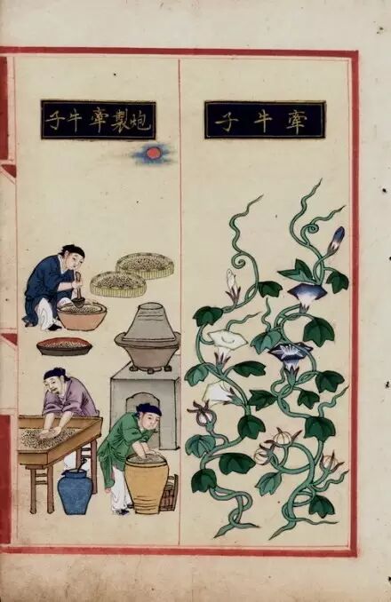 2005年由上海辞书出版社出版的明代孤本《补遗雷公炮制便览》(14卷),更是一本绘画精彩的图谱。它收录药物近千种,配图1162幅。这些图画出自宫廷画家之手,风格细腻,色彩绚丽,是我国古代插图史中的极品。图2是该书的《牵牛子》图,分左右页。右页为一年生缠绕草木牵牛花,叶呈心脏形,通常为3裂,秋季开花,花白色呈漏斗状。其子称牵牛子,入药,性寒,有逐水消积的作用。左页为牵牛子炮制图,图中3名药工分别在杵药、研药、淘药,各就各位,展示了古代炮制药物的主要手段和工具。图中人物神态维妙维肖、栩栩如生,重现了400年前制药铺子的忙碌。