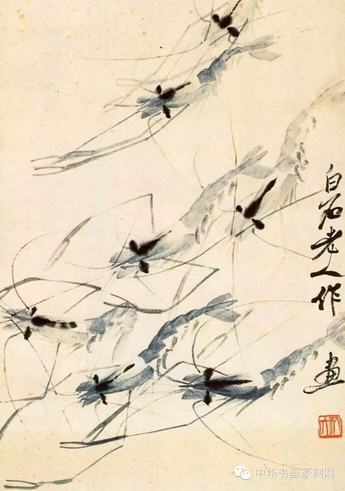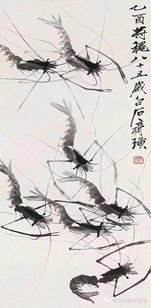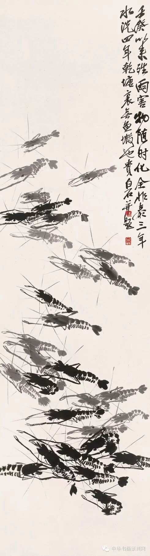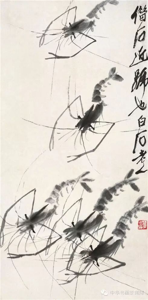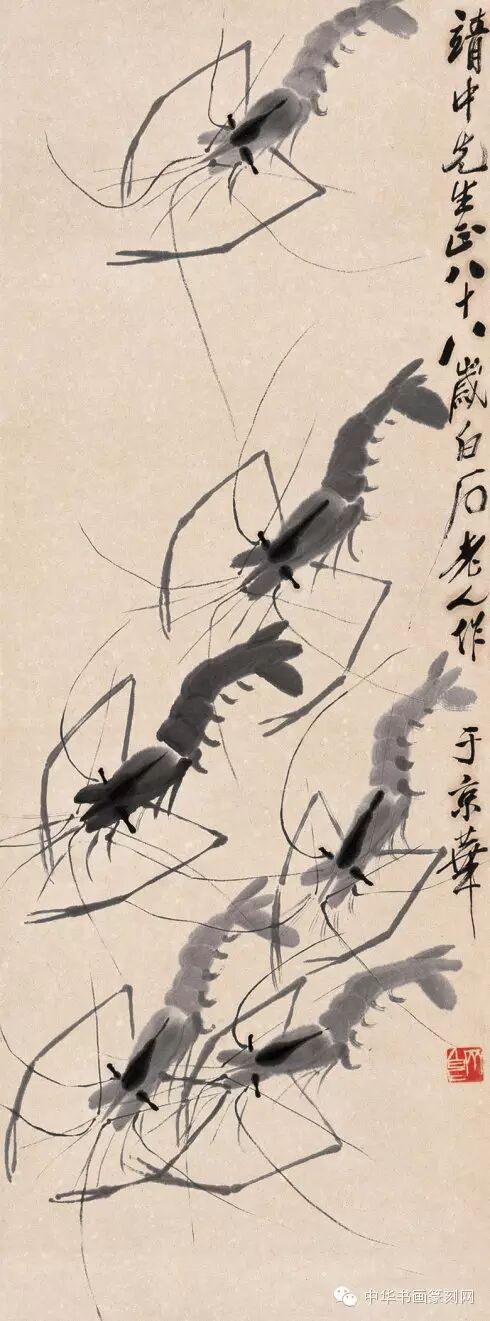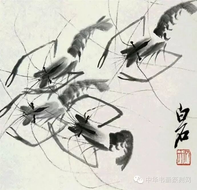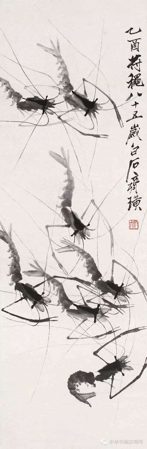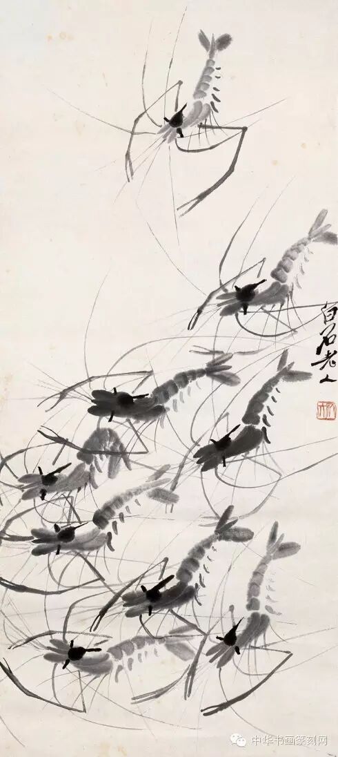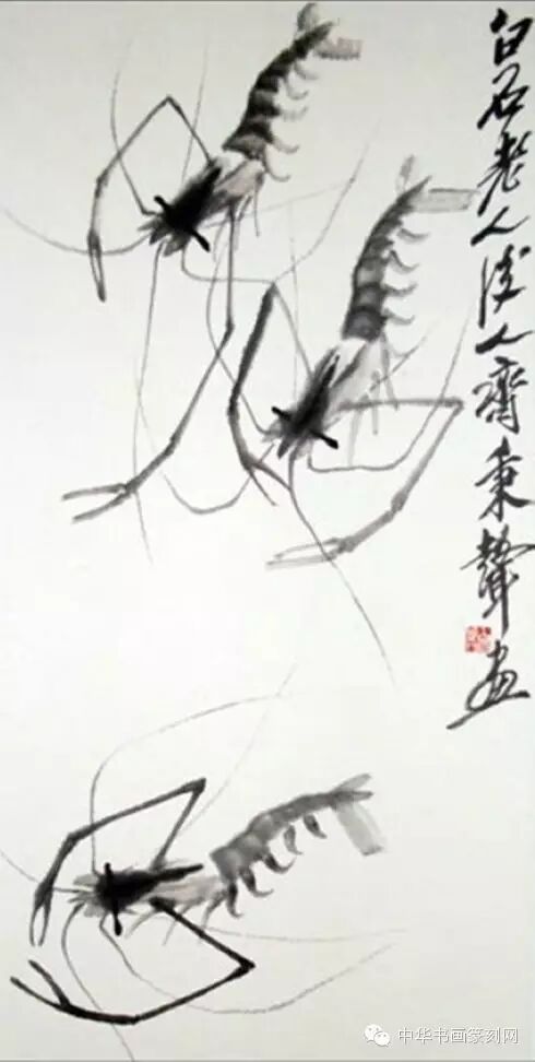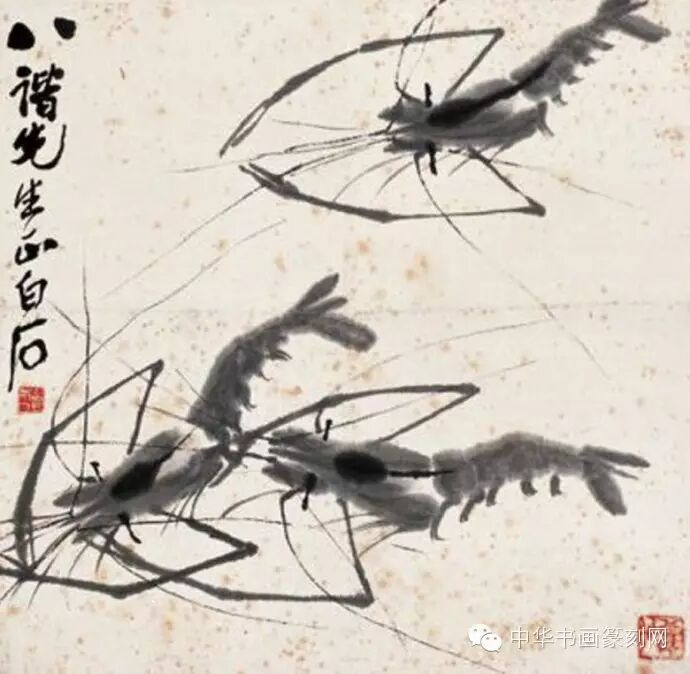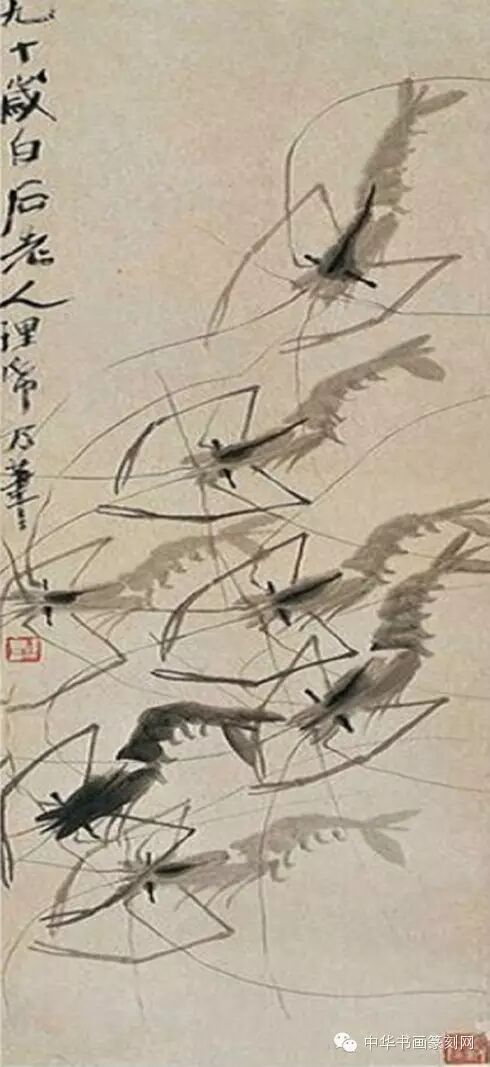 齐白石画虾可说是画坛一绝,灵动活泼,栩栩如生,神韵充盈,用淡墨掷笔,绘成躯体,浸润之色,更显虾体晶莹剔透之感。懂得笔墨也善于操纵笔墨的齐白石,他在下笔画虾时,既能巧妙地利用墨色和笔痕表现虾的结构和质感,又以富有金石味的笔法描绘虾须和长臂钳,使纯墨色的结构里也有着丰富的意味,有着高妙的技巧。以浓墨竖点为睛,横写为脑,落墨成金,笔笔传神。细笔写须、爪、大螯,刚柔并济、凝练传神,显示了画家高妙的书法功力。