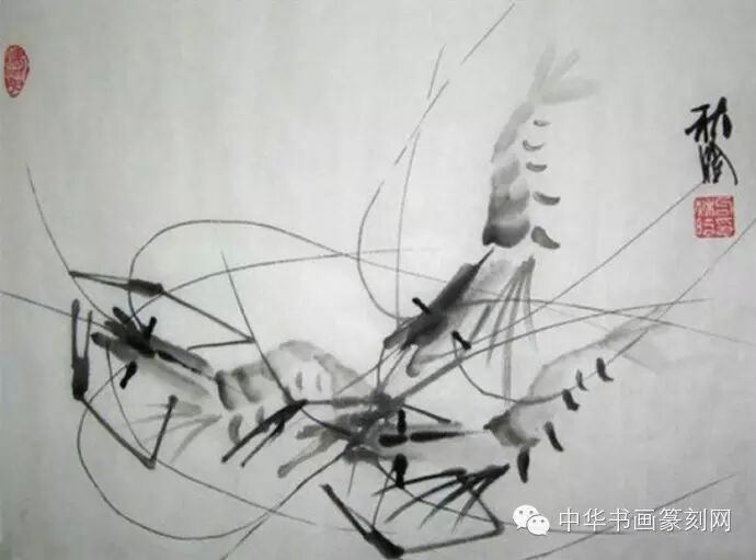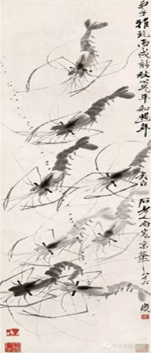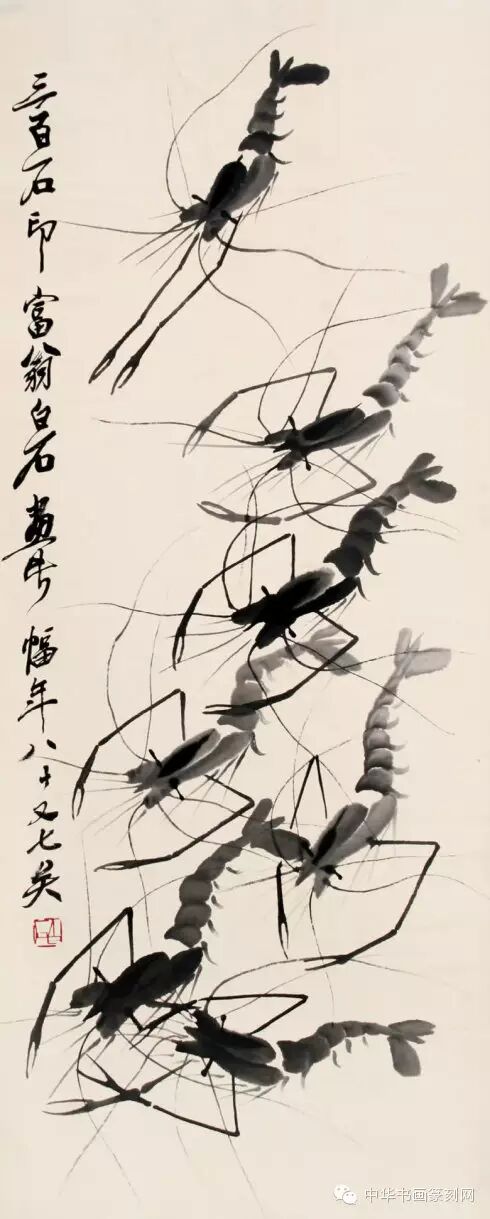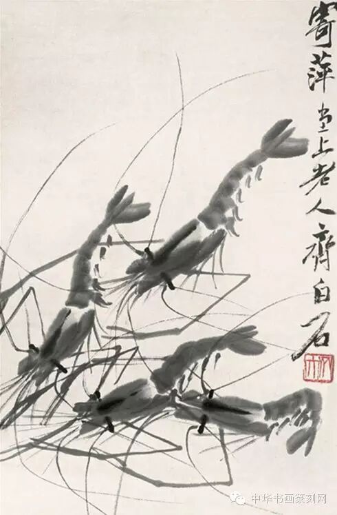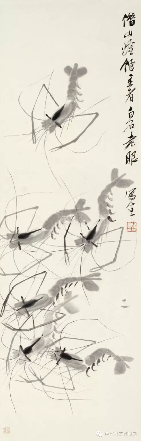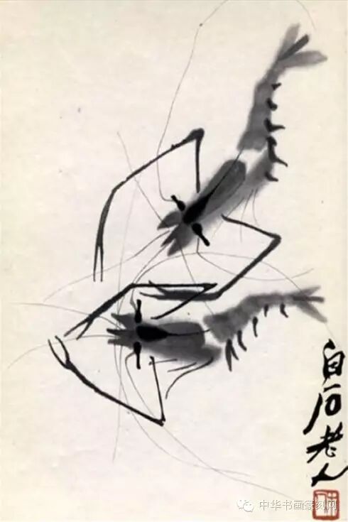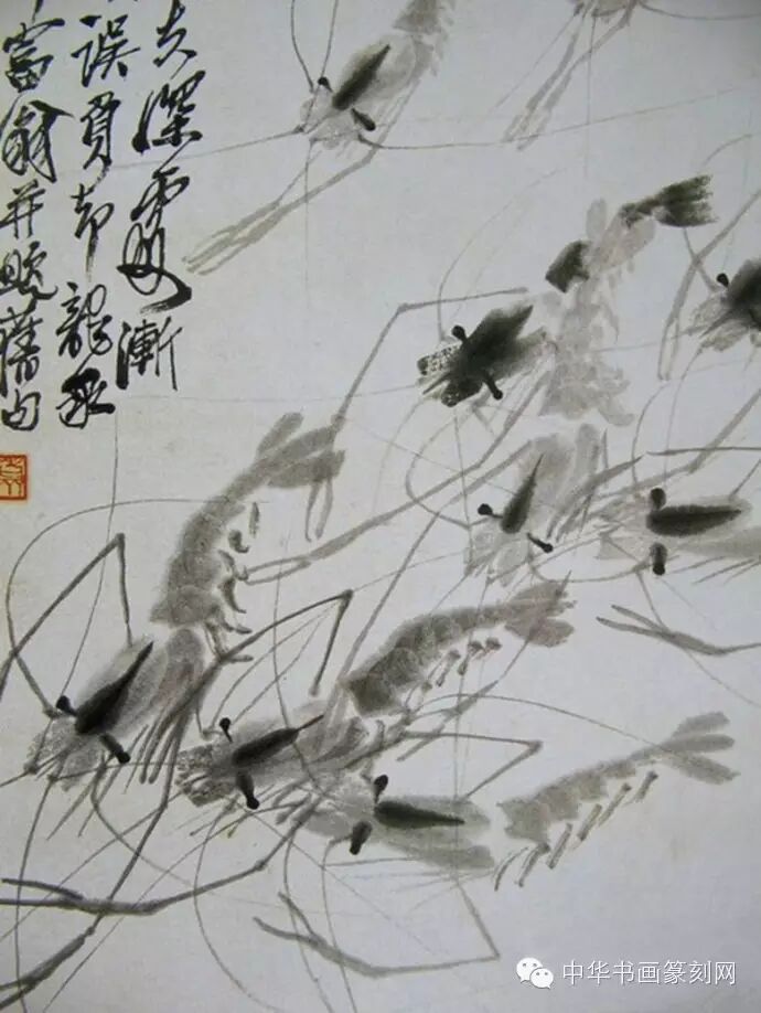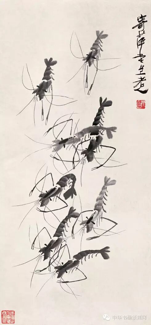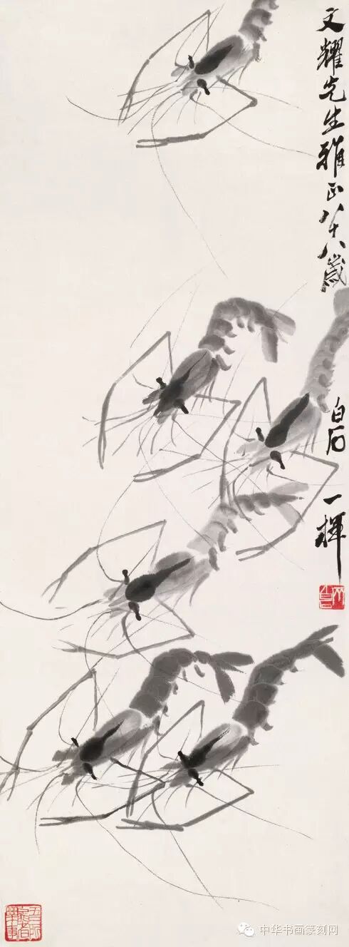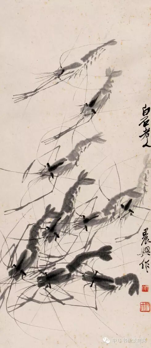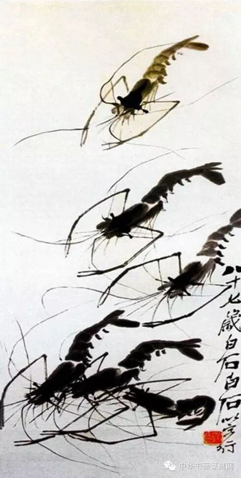 齐白石画虾可说是画坛一绝,灵动活泼,栩栩如生,神韵充盈,用淡墨掷笔,绘成躯体,浸润之色,更显虾体晶莹剔透之感。懂得笔墨也善于操纵笔墨的齐白石,他在下笔画虾时,既能巧妙地利用墨色和笔痕表现虾的结构和质感,又以富有金石味的笔法描绘虾须和长臂钳,使纯墨色的结构里也有着丰富的意味,有着高妙的技巧。以浓墨竖点为睛,横写为脑,落墨成金,笔笔传神。细笔写须、爪、大螯,刚柔并济、凝练传神,显示了画家高妙的书法功力。