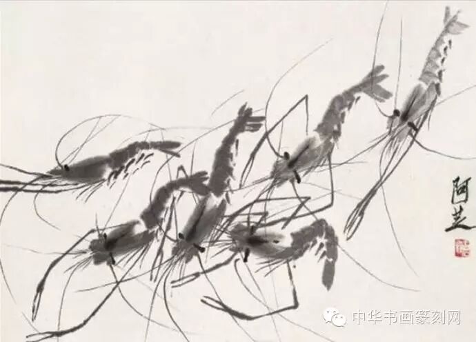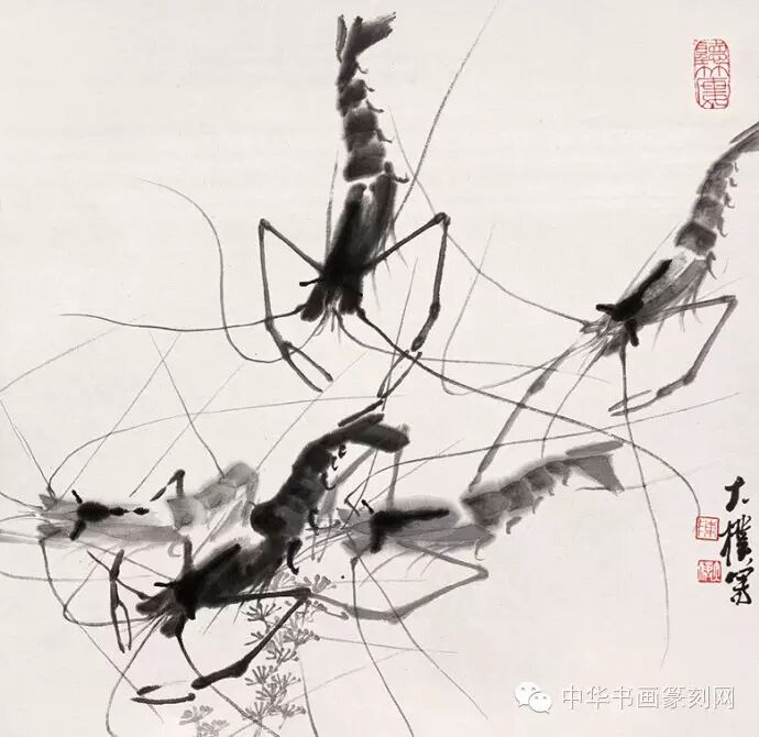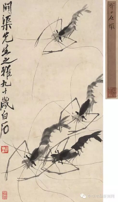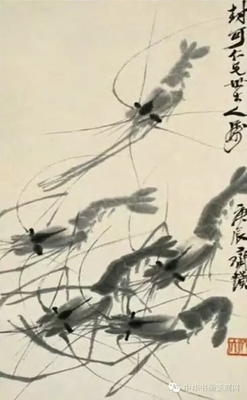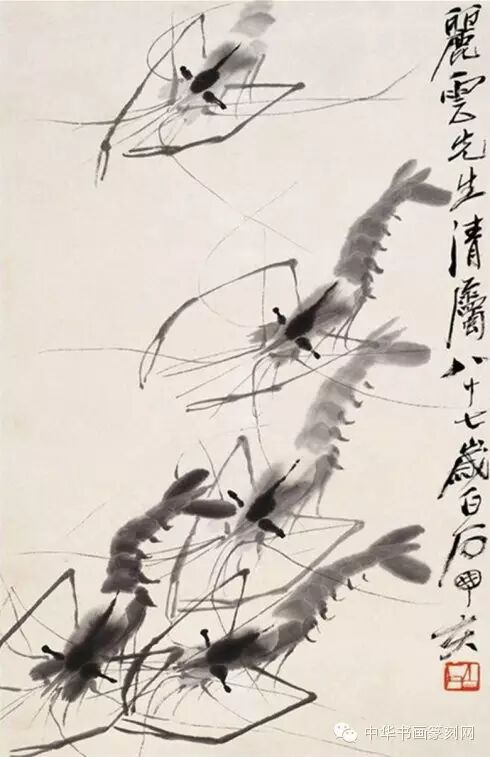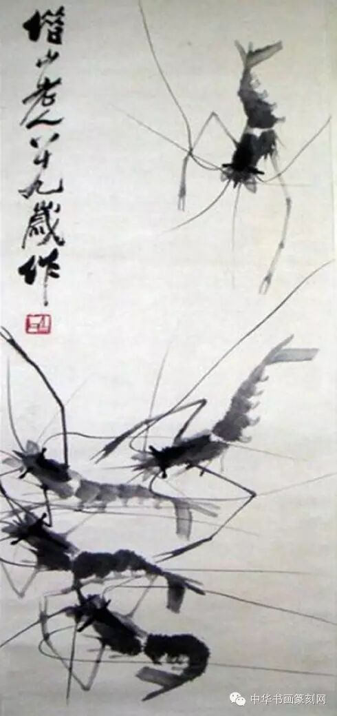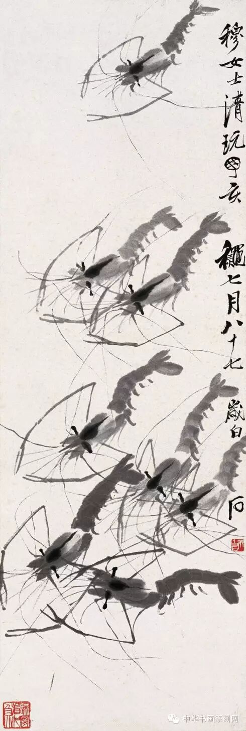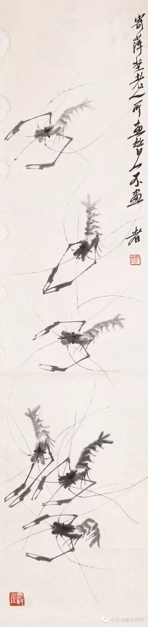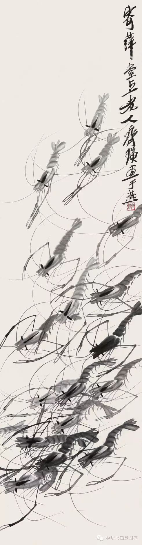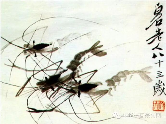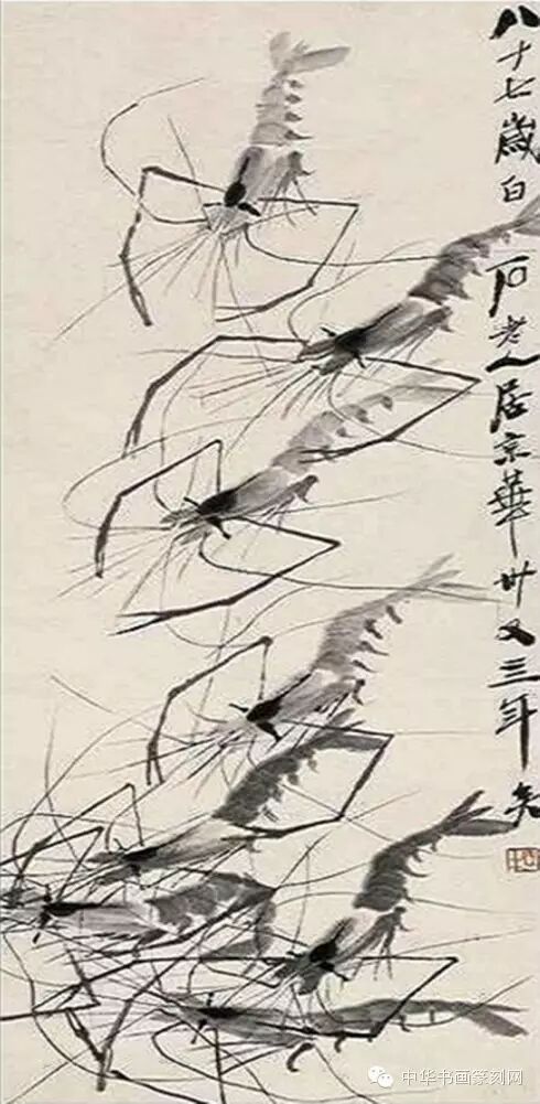 齐白石画虾可说是画坛一绝,灵动活泼,栩栩如生,神韵充盈,用淡墨掷笔,绘成躯体,浸润之色,更显虾体晶莹剔透之感。懂得笔墨也善于操纵笔墨的齐白石,他在下笔画虾时,既能巧妙地利用墨色和笔痕表现虾的结构和质感,又以富有金石味的笔法描绘虾须和长臂钳,使纯墨色的结构里也有着丰富的意味,有着高妙的技巧。以浓墨竖点为睛,横写为脑,落墨成金,笔笔传神。细笔写须、爪、大螯,刚柔并济、凝练传神,显示了画家高妙的书法功力。