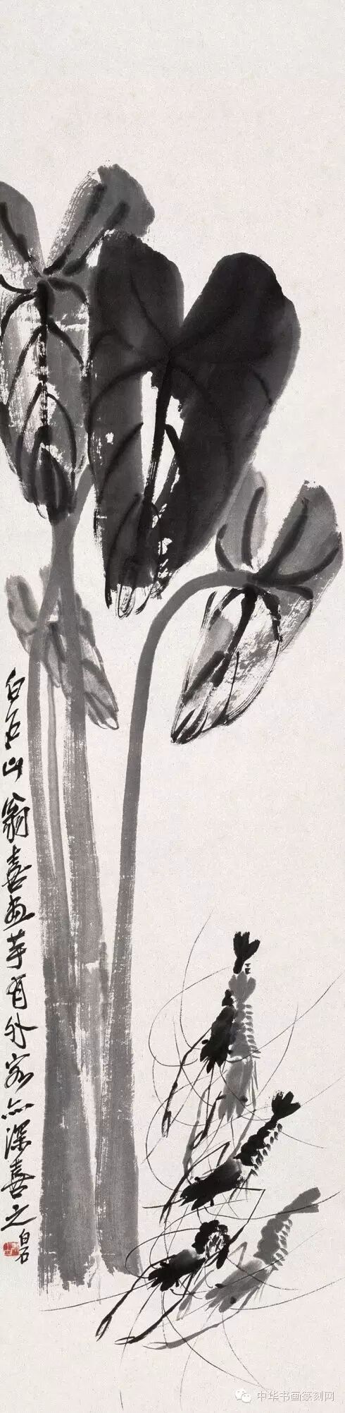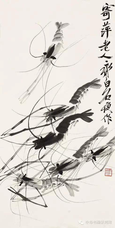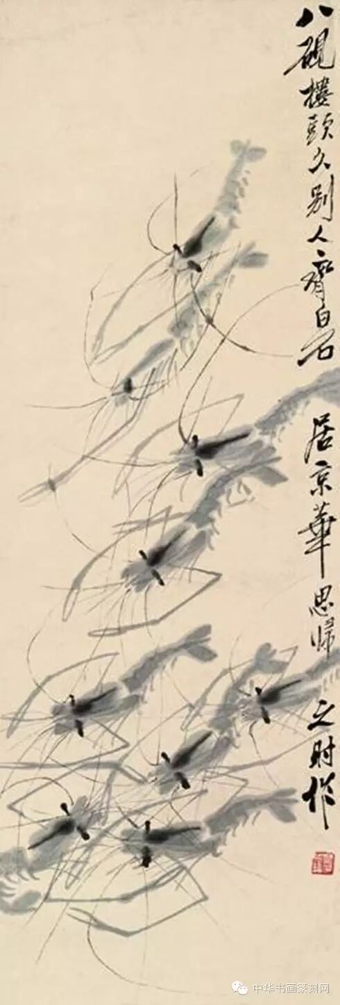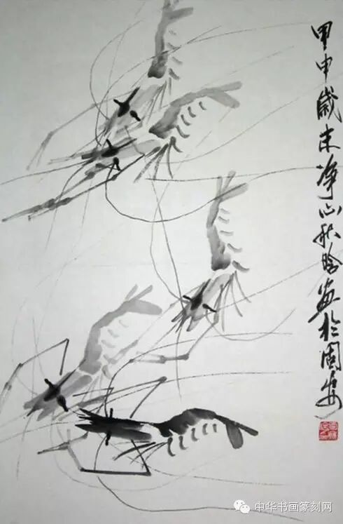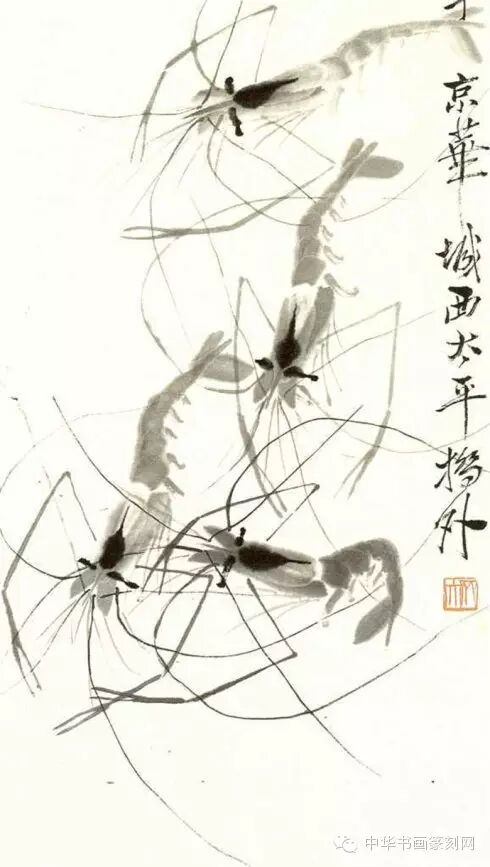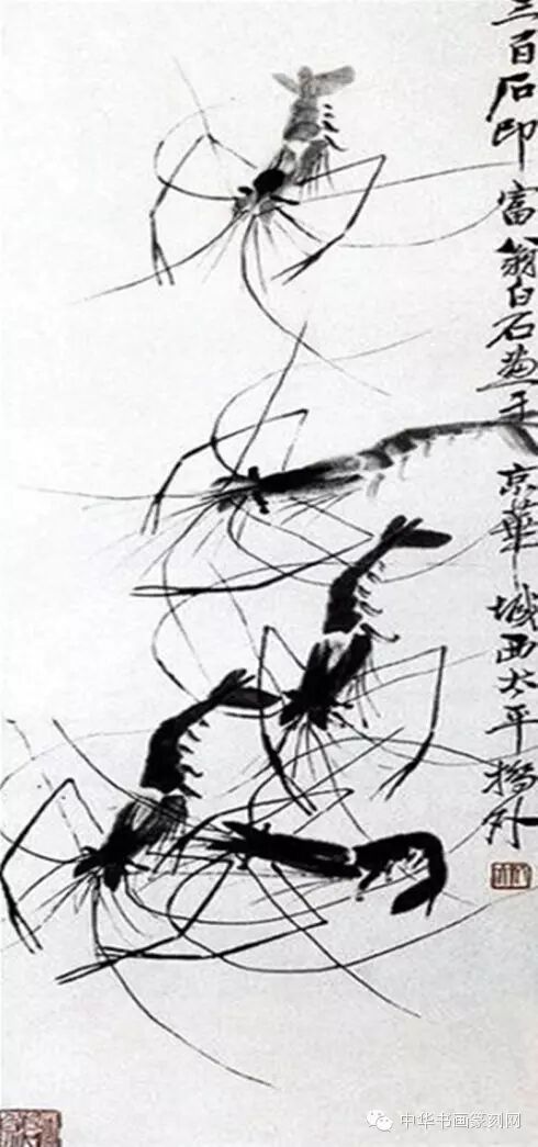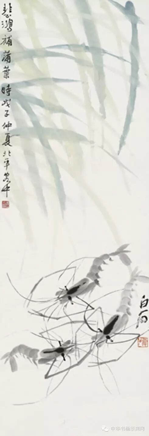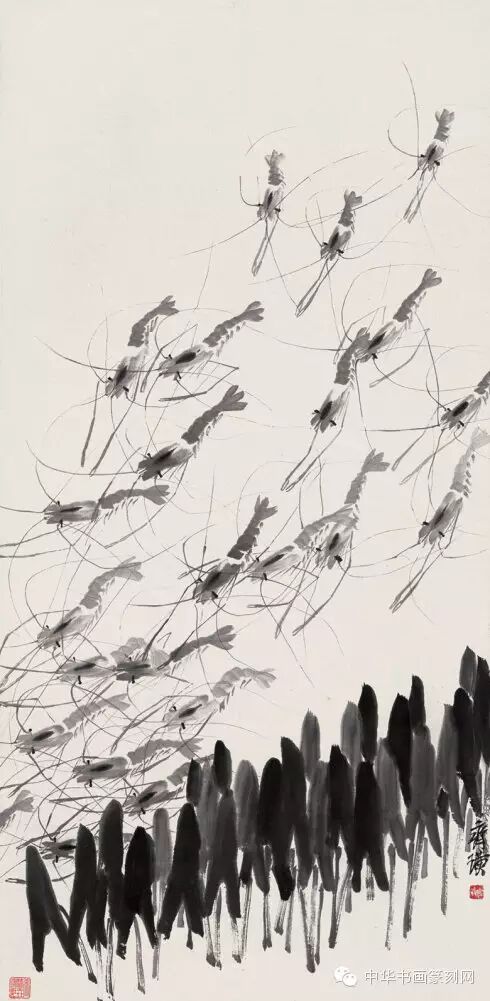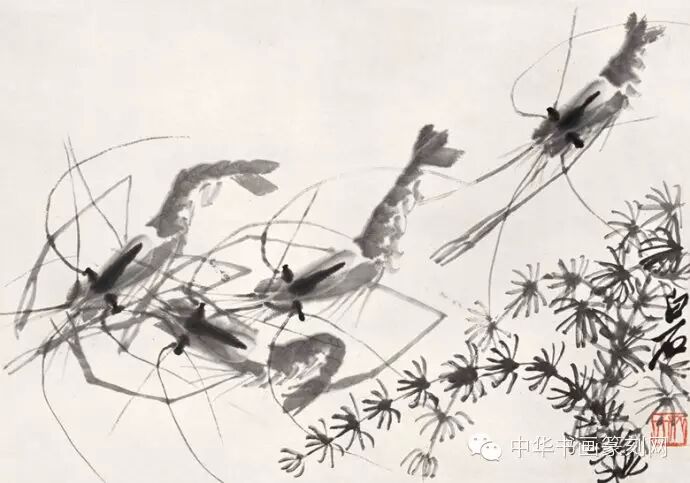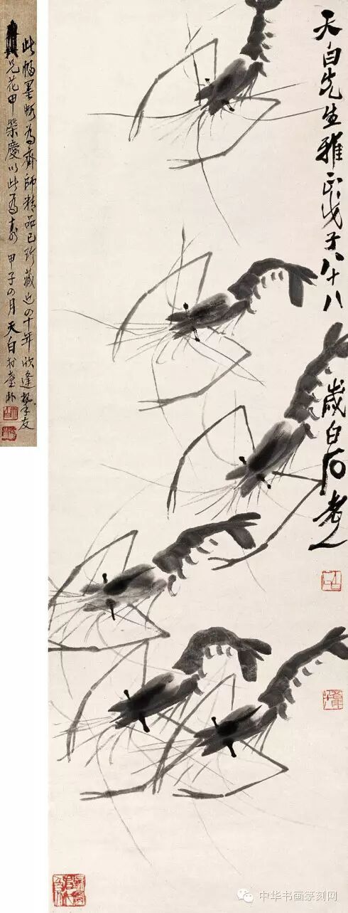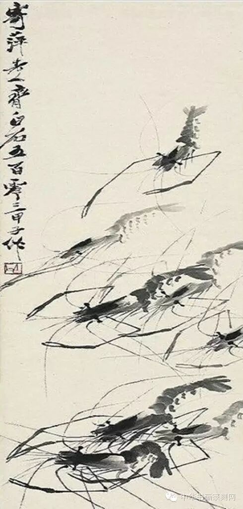 齐白石画虾可说是画坛一绝,灵动活泼,栩栩如生,神韵充盈,用淡墨掷笔,绘成躯体,浸润之色,更显虾体晶莹剔透之感。懂得笔墨也善于操纵笔墨的齐白石,他在下笔画虾时,既能巧妙地利用墨色和笔痕表现虾的结构和质感,又以富有金石味的笔法描绘虾须和长臂钳,使纯墨色的结构里也有着丰富的意味,有着高妙的技巧。以浓墨竖点为睛,横写为脑,落墨成金,笔笔传神。细笔写须、爪、大螯,刚柔并济、凝练传神,显示了画家高妙的书法功力。