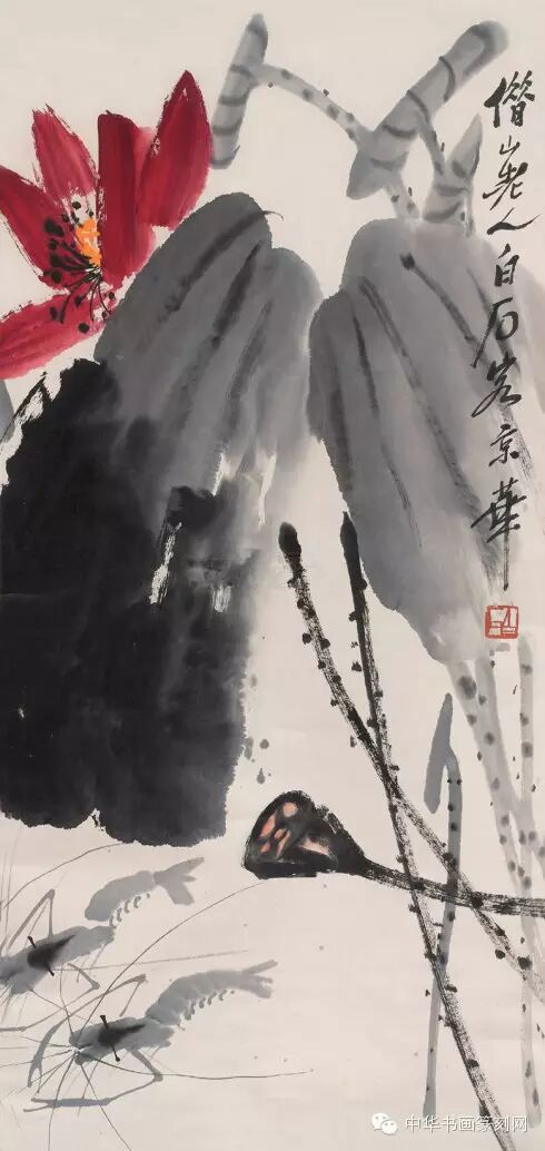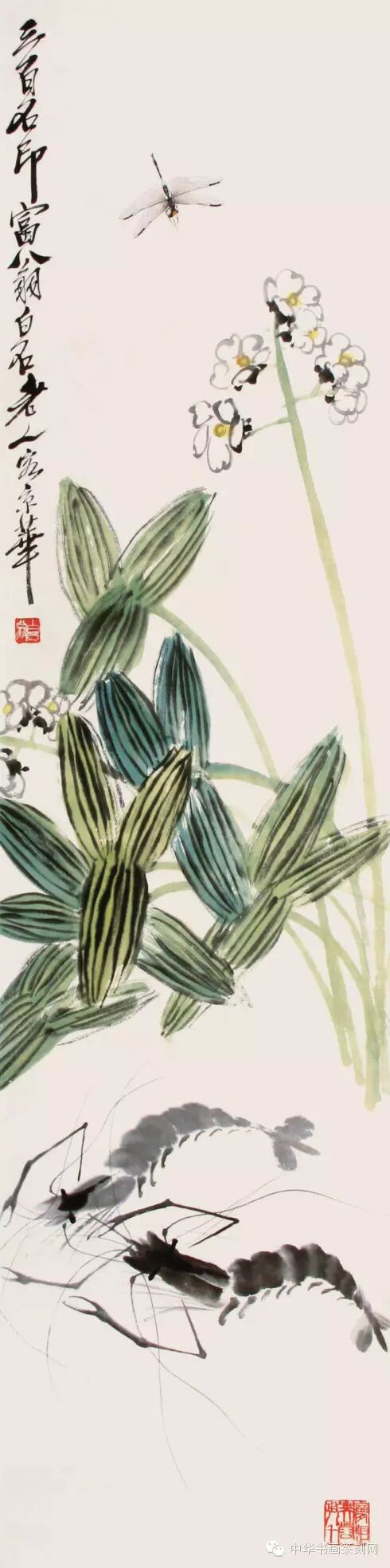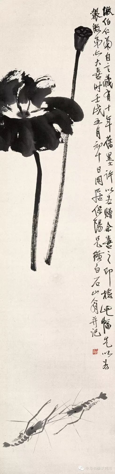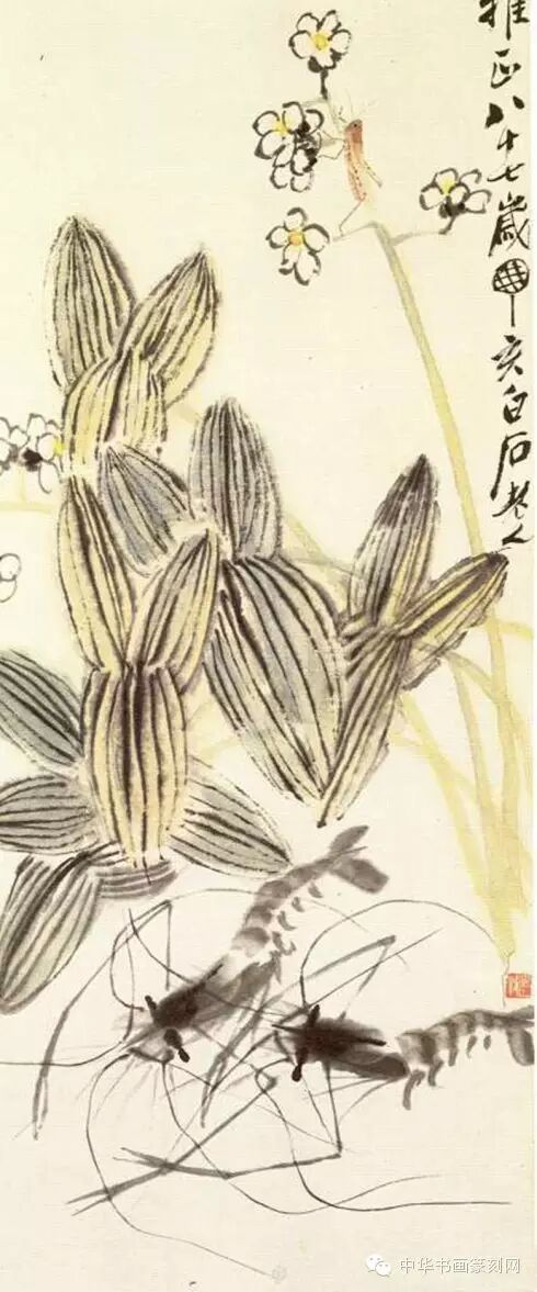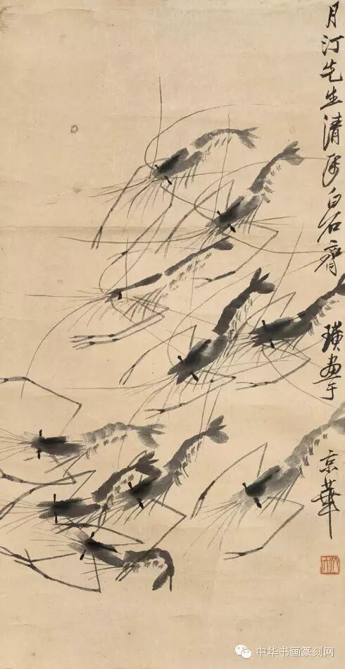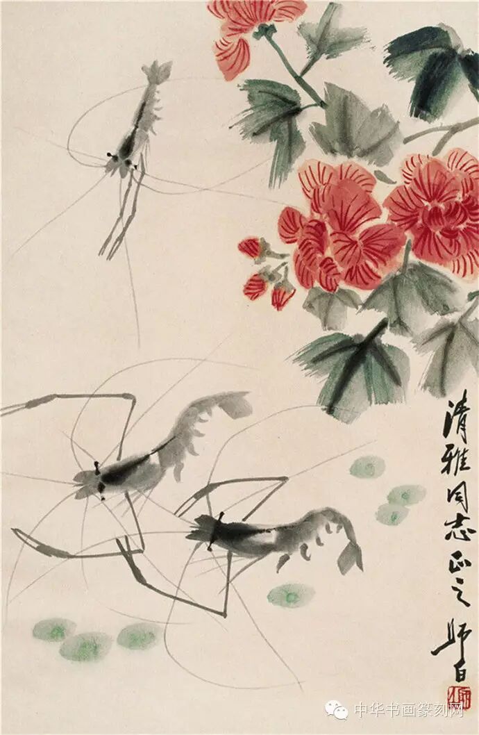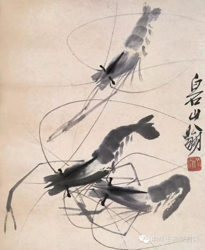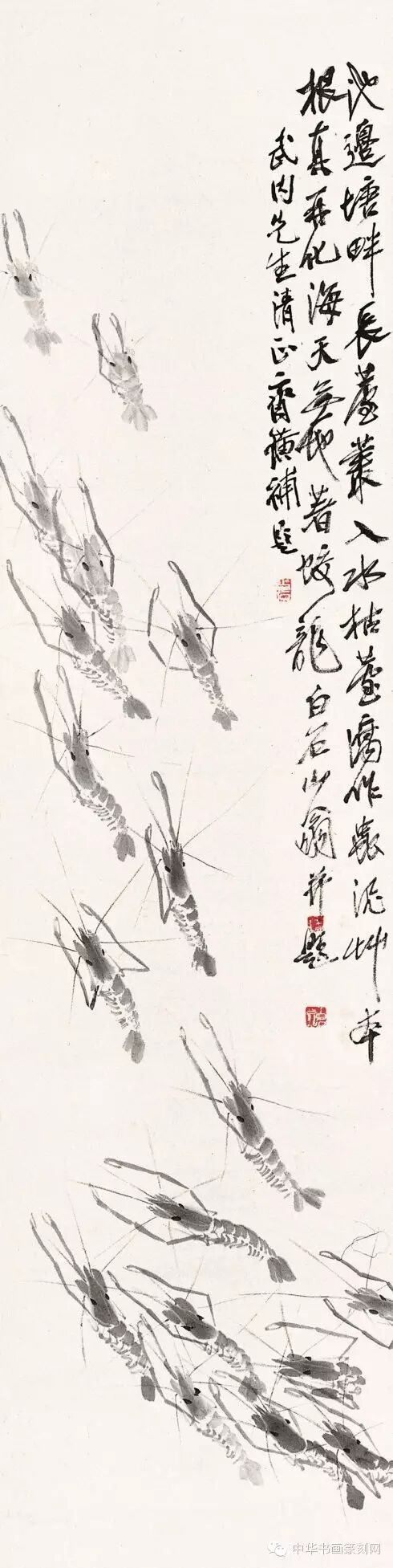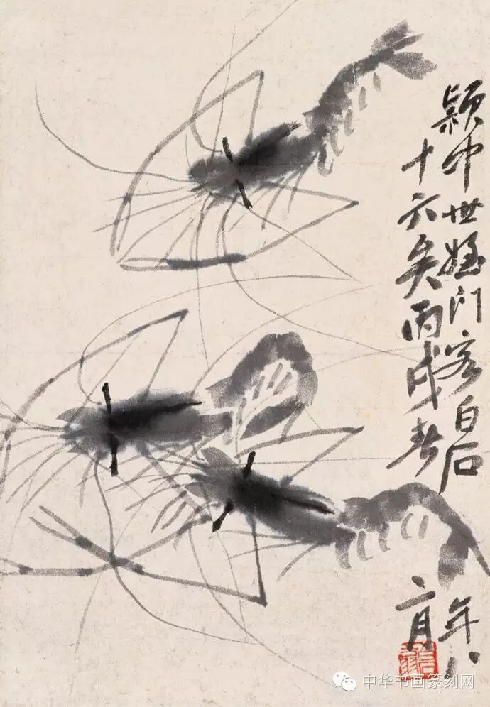 齐白石画虾可说是画坛一绝,灵动活泼,栩栩如生,神韵充盈,用淡墨掷笔,绘成躯体,浸润之色,更显虾体晶莹剔透之感。懂得笔墨也善于操纵笔墨的齐白石,他在下笔画虾时,既能巧妙地利用墨色和笔痕表现虾的结构和质感,又以富有金石味的笔法描绘虾须和长臂钳,使纯墨色的结构里也有着丰富的意味,有着高妙的技巧。以浓墨竖点为睛,横写为脑,落墨成金,笔笔传神。细笔写须、爪、大螯,刚柔并济、凝练传神,显示了画家高妙的书法功力。