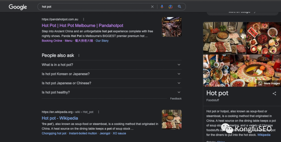 与PPC相对应的是谷歌自然搜索排名,行业内也称为“搜索引擎优化”也即“SEO”,SEO的英文全称是“Search Engine Optimization”即“搜索引擎优化“。搜索引擎优化的营销推广目标和你在谷歌搜索结果页面看到带AD标记的结果不同,通过搜索引擎优化的网站会自然地出现在搜索页面的首页或者前三的位置。比如在谷歌输入“谷歌搜索引擎优化”,排名第一的就是我们,很多用户会点击进入kongfuseo.com.au 网站。这个时候,Kongfuseo并不需要给谷歌支付广告费用。