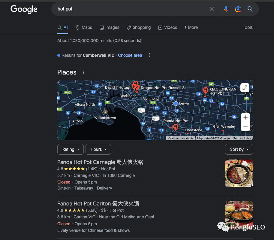如果搜索"hot pot" 无论是地图还是自然搜索,排名第一的都是"蜀大侠“