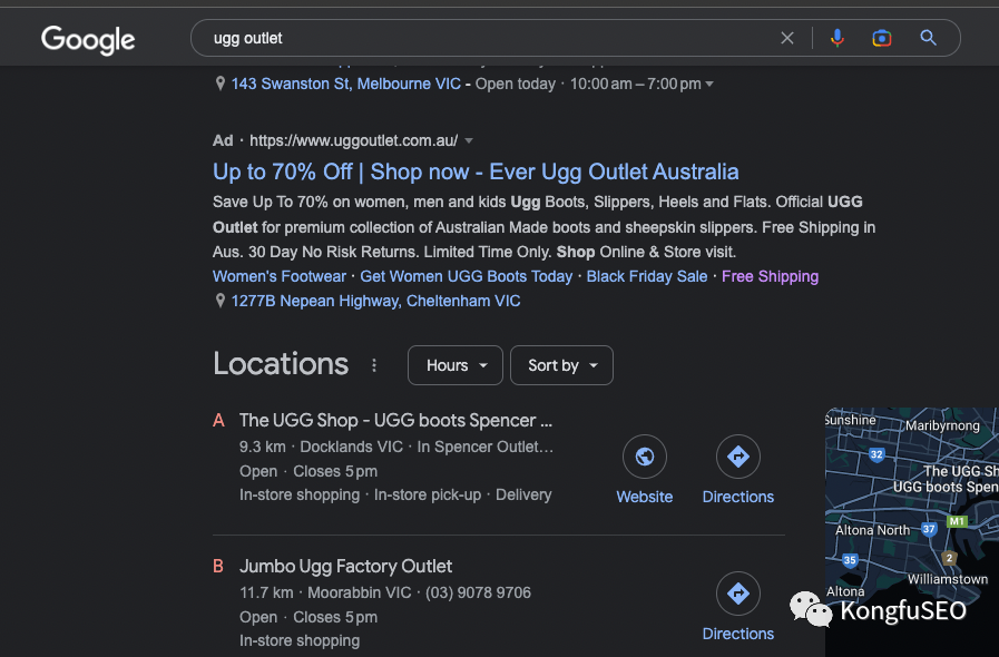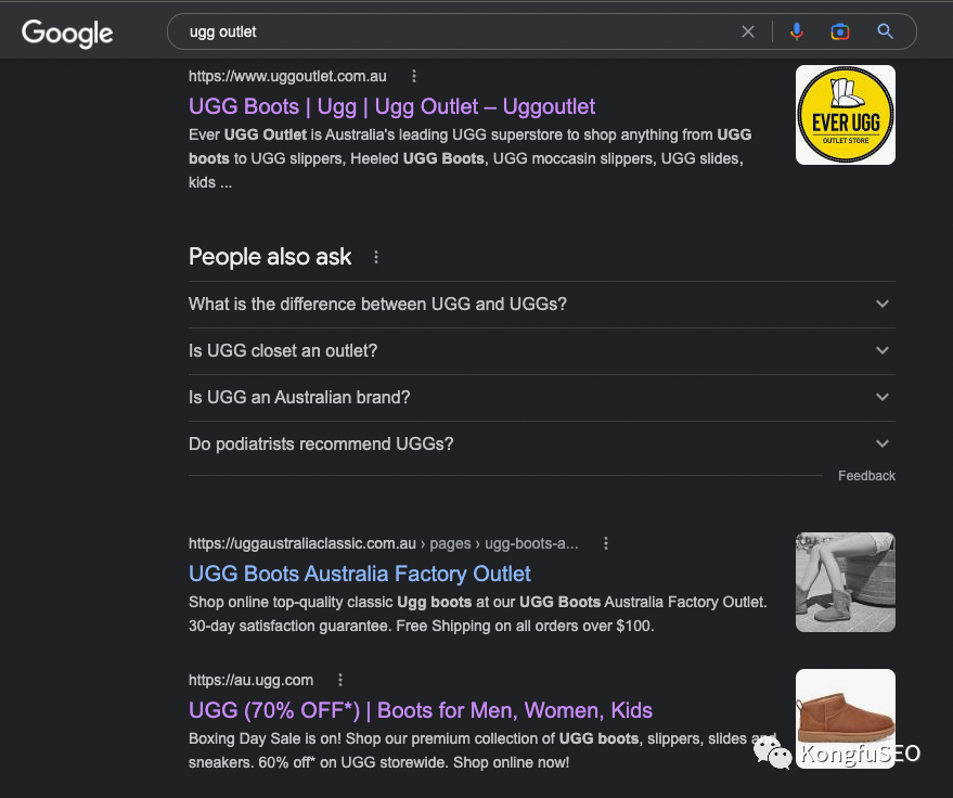 “点击付费广告PPC”是你需要支付给谷歌每次有效点击的费用,每个关键字的标称价格都是浮动的,在您达到出价要求后,谷歌会把你推广内容呈现在搜索结果特定的广告区域。早期,就连我们团队自己都怀疑谷歌广告是否值得投放,但是经过7年的广告运营和SEO服务,我们更相信多渠道推广的优势。比如我们多数客户为了更多占据首页排名位置,挤走竞争对手,就在SEO取得好的排名同时,也投放谷歌广告。比如“ UGG Outlet", 同时占据了首页2个主要的位置:
