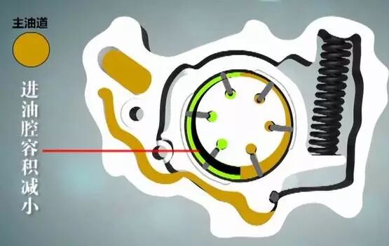 上图所示的是叶片式变排量液压泵的工作原理。发动机转速提高时,高压的机油推动转子压缩弹簧。转子的内壁将可伸缩的叶片向旋转中心推动,封闭的油腔容积降低,有效地降低了机油泵的排量,减少了发动机功率在驱动机油上消耗的功率。车速降低至转速提高前时,机油压力降低,弹簧推动转子复位,叶片随即伸长,油腔容积也变为原来的大小。