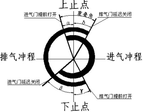 四冲程汽油发动机工作时,进气门在上止点之前打开,在下止点之后关闭(见上图“进气冲程”);排气门在下止点之前开启,在上止点之后关闭(见上图“排气冲程”)。由于在上止点处,进气门提前打开而排气门延迟关闭,会导致进排气门同时开启一段时间,这段时间称为气门重叠,在图中所对应的角度叫做气门重叠角。气门重叠时,进气门提前打开使得进入缸内的新鲜可燃混合气数量增加,并驱赶残余的废气通过排气门排出,这对发动机的性能有着巨大的影响。气门正时技术的发明,让气门重叠角度变得可控,使得发动机能依据不同的工况获得不同的输出特性。而在这项技术发明之前,气门重叠角是一个定值,并可以直接影响到发动机的具体用途。