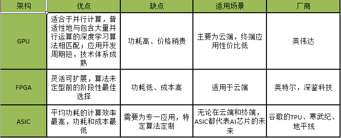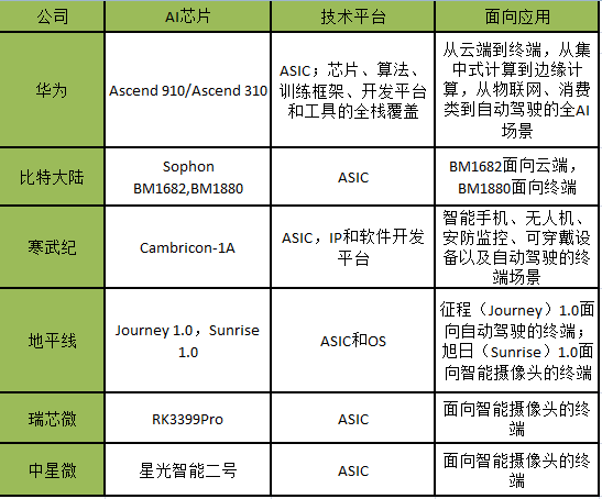 这个表中罗列的是以ASIC为架构的AI芯片企业,可以窥见鲜明的中国特色,基本上所有的企业都会发布针对智能摄像头的AI芯片。当然,这其中不包括专门面向自动驾驶的百度和深鉴科技,只是这两家目前以FPGA为主,待自动驾驶的场景和算法成熟后,不排除会迁移到ASIC架构的可能。