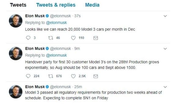 在2017年7月3日,马斯克先生发出twitter,生产在2017年12月,Model 3的产能将会高达每月2万辆。