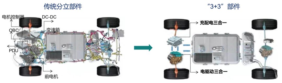以比亚迪e平台为例,在电动汽车最为关键的电驱动平台方面上,实现了电驱动三合一和高压三合一。将此前分散的电控、电机和减速器整合为一体,同时又将OBC、DC-DC和PDU合三为一,从而简化了机械结构,减少了连接关系。