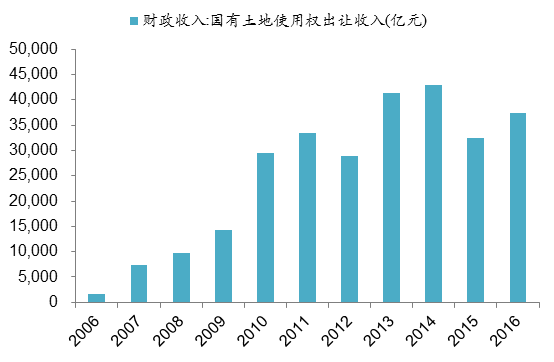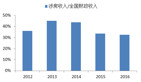 近年来,在全国政府财政收入中,房地产相关的各种税收(房地产营业税、企业所得税、契税、房产税、土地增值税等)加上土地出让金收入占比最高达到约45%,2016年仍在30%以上(由于营改增的影响,该比例存在低估)。可见,房地产对政府财政收入构成了重要支撑。