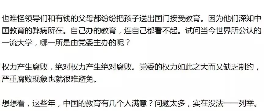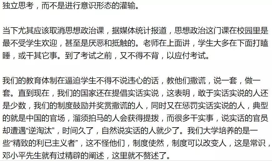 老师发表不同意见还可能面临处罚,甚至被开除,这哪里还有半点学术自由?容不得不同意见,听不得别人批评,是没有自信的表现。我们天天说要三个自信,其实正是缺乏自信的表现。真正的自信在人的内心深处,是不需要拿出来说的。