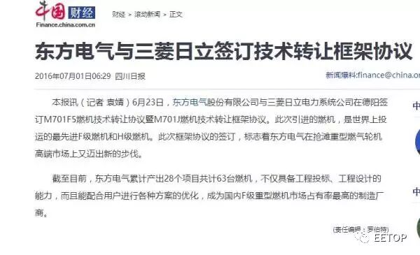 2016我国东方电力股份有限公司引进了三菱日立的燃气机轮,是世界上投运的最先进F级,H级燃机。