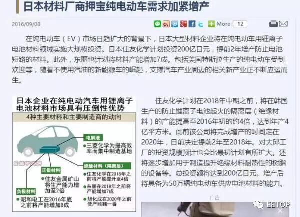 但在上游电池材料供应中,日本住友化学,东丽, 昭和电工,三菱化学在纯电动汽车EV上游产业链有压倒性的优势。东丽,住友化学为松下,LG供货。