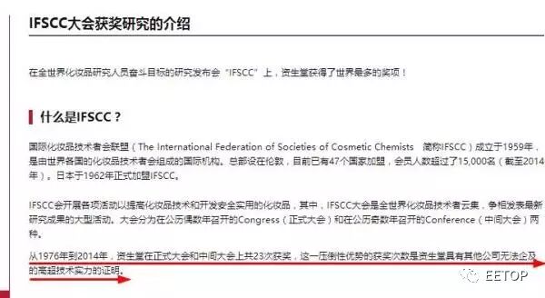 介绍一下IFSCC是干什么的: IFSCC大会是全球化妆品界公认最重要的科学会议,在每偶数年举办一次最具权威性的研究发表会IFSCC congress,在2005年起的每奇数年举办一次以教育培养年轻研究人员为目的IFSCC conference,每届会从口头发表基础组,口头发表应用组和海报发表组中各选出一名top award,资生堂不论是在congress(15回)还是在conference(4回)上获得top award次数都保持绝对优势 另外此大会上被授与top award总次数第2多的企业同样来自日本(pola chemical industries)!这家也是很牛逼的化妆品公司。 资深堂在化妆品产业科研贡献,几乎胜过任何一家国际化妆品公司。