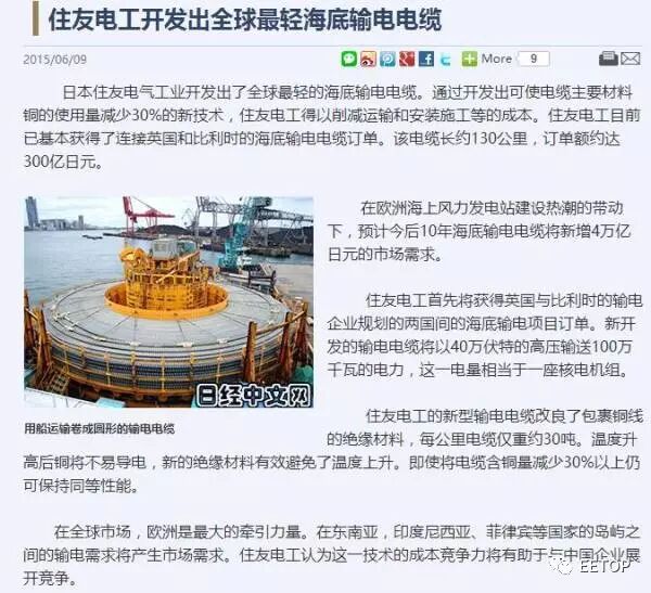 海底电缆,目前日本住友电工在此领域的技术为世界NO1.其开发的全球最轻海底输电电缆已经向英国和比利时的海底电缆供货,长度约130公里,价格为300亿日元。并在菲尼宾,东亚,印度尼西亚有广阔的前景。
