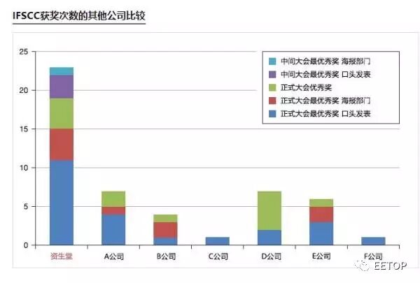 资深堂是世界唯一23次获得IFSCC最优秀奖的化妆品厂家。且遥遥领先其他国际化妆品公司。最近还因为揭示皮下脂肪细胞的肥大化以及随年龄增长产生的肌肤弹性衰退与法令线加深,脸颊形状老化间的机理关系”而荣获2014年在巴黎举办的第28届IFSCC congress top award(国际化妆品化学家学会联盟最优秀奖);这是资生堂连续第5届在IFSCC大会上取得top award,也是包含congress和conference在内的总计第23次获得top award,遥遥领先所有竞争对手