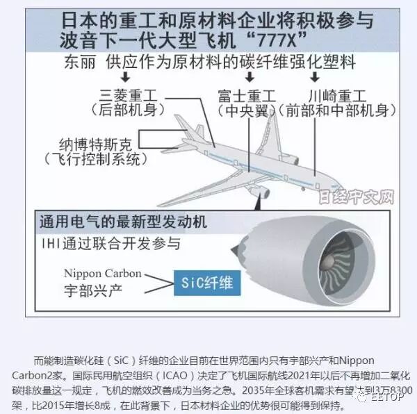 继碳纤维之后, 源自日本的新材料SIC纤维将又一次推动世界技术革新。 新一代飞机的发动机核心零部件将采用日本开发的新材料。美国通用电气(GE)将在最新型发动机上采用日本厂商制造的重量轻、且具备高耐热性的碳化硅(SiC)纤维。宇部兴产等日本2家厂商供应。