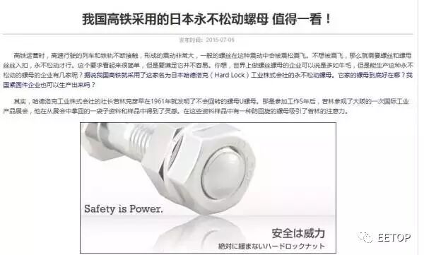 世界螺母NO1。 那就是只有49名员工的小企业日本哈德洛克(Hard Lock)工业株式会社的永不松的螺母。 不止中国,全世界包括英国、澳大利亚、美国等都要向日本哈德洛克公司公司订购小小的螺母,全世界只有这一家,可想而知,哈德洛克螺母的市场份额有多大,一颗螺母做到了极致。 这东西在工业领域有重要的作用。比如 在高铁时速350公里行进中,若固定螺丝的螺母发生松动,导致重要装置脱落,就会酿成重大事故 。 HardLock螺母成了全世界唯一的绝不松动的螺母, 除了铁路外,世界最长吊桥日本的“明石海峡大桥”、世界最高的自立式电波塔“东京天空树”、美国的航天飞机发射台、海洋钻探机等国内外许多国家和地区,都采用了“Hard Lock螺母 。