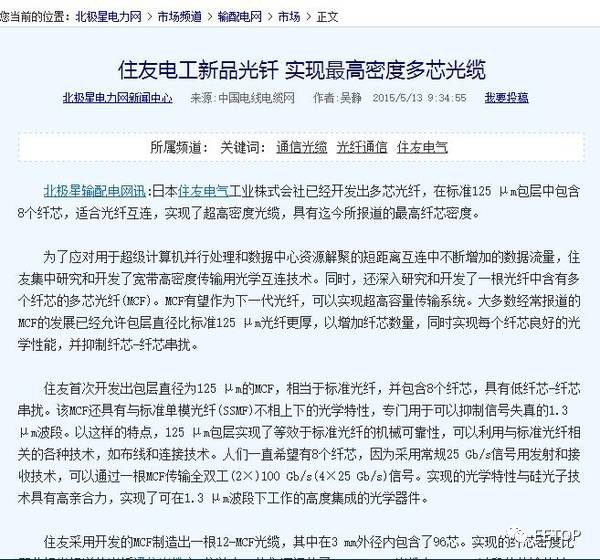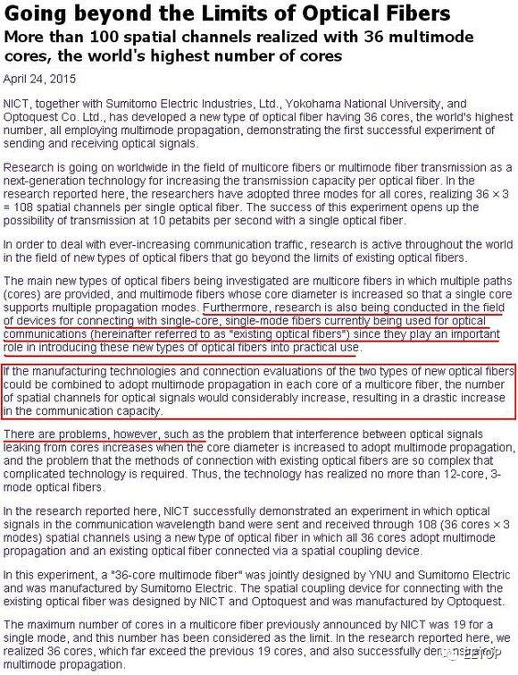 nict与住友电工 横滨国立大学 optoquest株式会社共同开发出36光芯兼每条光芯都可以3种模式传递信息的世界最强性能多功能光纤 ,成功开辟了利用单根光纤进行10pbps级超大容量传输的可能性,成果已于去年3月被在洛杉机召开的光纤通信界的最大国际会议ofc 2016选为最热点话题文章 。
