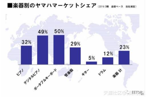 市场份额方面,除了吉他较低外,其余都有相当的存在感(按照金额计) 下图为雅马哈的市场份额,从左到右分别是钢琴,数字钢琴,便携式电子琴,管弦乐器,吉他和鼓。雅马哈占股全球乐器市场的23%,名副其实的压倒性优势。