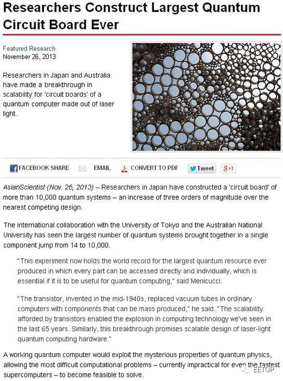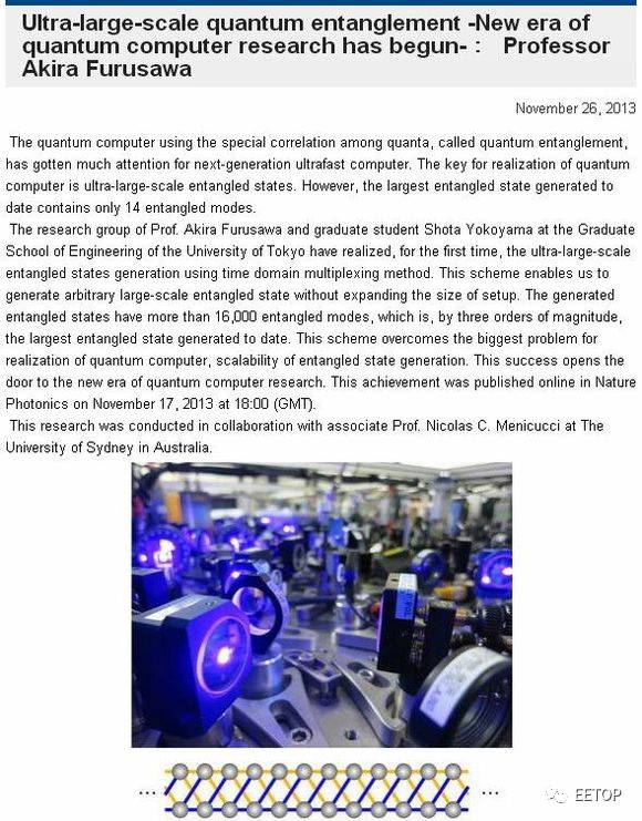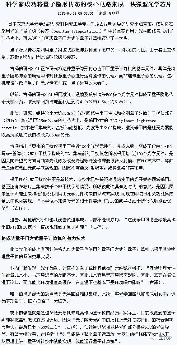 东京大学prof.akira furusawa联合ntt先端设备技术研究所,将furusawa博士在2013年研制的世界首个完全态量子隐形传送装置的心脏部——用来生成检出量子纠缠的核心电路集成到一块以ntt拥有的纳米平面光波回路加工工艺为基础制作的微型硅芯片上,并成功在这个氧化硅衬底ic中发生和检测到量子纠缠,通过将布满了巨量光学器件的约1平方米的光平台复制缩小到面积0.0001平方米(26x4毫米)兼可升级的石英系基板上,突破性的解决了进行量子隐态传输时承载在光子上的量子位信号因光学系统内元件配置制约导致的运算扩展瓶颈;furusawa博士的下个课题是争取把光源二极管等非量子纠缠生成检出部分也完成聚集化,减少光纤损耗对量子位精度和稳定度的影响,向制造出超高速量子计算机和超大容量量子通信的目标迈进