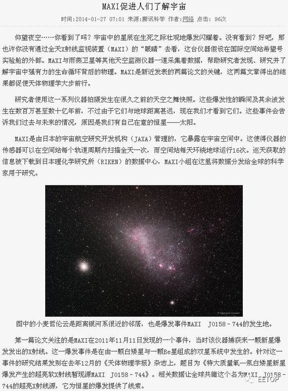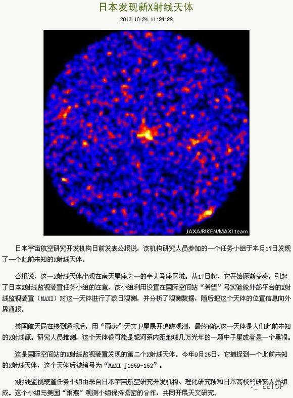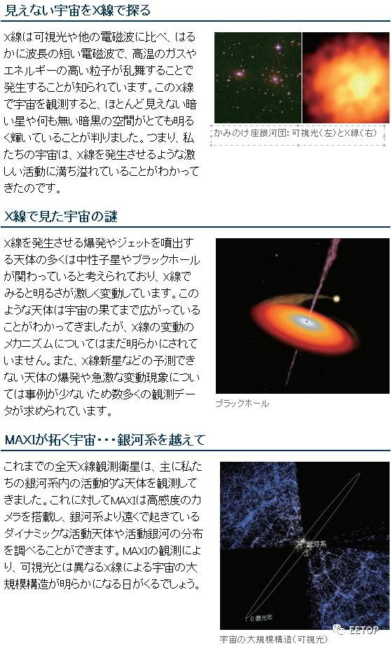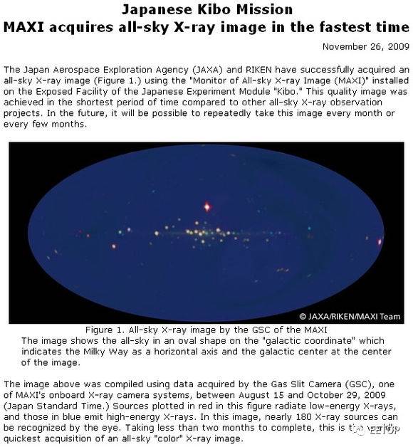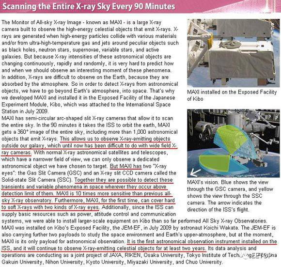 世界最速兼唯一有能力探测外银河系高能量的全天候天文仪器——maxi(全天候X射线监视装置);maxi搭载了由jaxa和riken共同开发的世界最广视野狭缝监视摄像机(12固态+2气态),放置于国际空间站日本实验舱kibo号外平台,随kibo号沿空间轨道移动可每92分钟完成一次对银河系的360度扫描,将以往千余个X线变光源的一轮分析时间由数日至数周缩短到一个半小时左右;不设特定对象,以最敏感的观测力捕捉宇宙空间内任何一处超新星 中子星 黑洞 伽玛暴的瞬间突发和后续可变现象