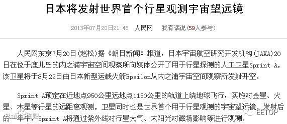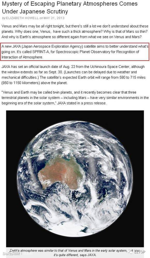 世界首支行星观测用(极紫外分光)太空望远镜——日本Sprint-A Sprint-A将尝试解明类地行星(火星 金星)在太阳系形成后的数亿年间因太阳风磁层导致的大气逃逸之迷,并通过观测最靠近木星的卫星“木卫一”产生的大量硫离子,来调查因它引起的木星中等离子体能量转移;Sprint-A已由日本新型火箭epsilon在本月中旬运载升空,投入使用中