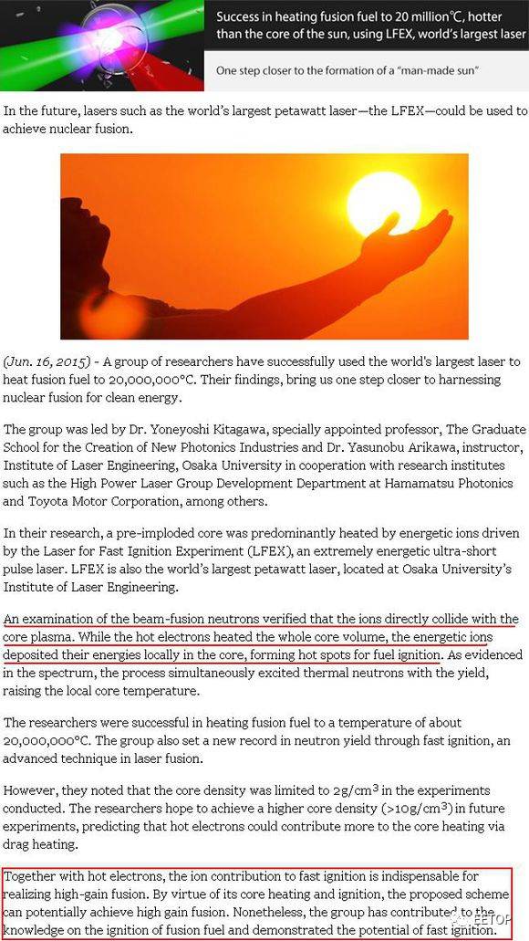 日本光产业创成大学院大学prof.yoneyoshi kitagawa联合hamamatsu(滨松光子株式会社)与大阪大学,利用hamamatsu开发的两支高往复ld(激光二极管)激励式固体激光对向照射直径0.5mm/厚7um的含有重氢的塑料球标靶制成球体堆芯,然后借助大阪大学超短脉冲高强度激光装置lfex的两条激光束从外部直角方向直接激发压缩成型的堆芯,成功将激光内爆反应时所需的热中子生成量由原先最多的2000万-3000万个一举增加至5亿个左右,同时确认其中离子流体产生的800万℃追加沉积热量是导致被加热前的800万℃燃料瞬间内爆至2000万℃的首要热源,即在世界首次成功使高速离子作为惯性约束核聚变加热介质的愿望变为现实