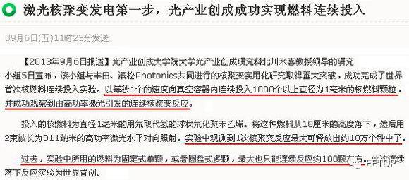 日本光产业创成大学院大学prof.yoneyoshi kitagawa领导的研究小组在世界首次实现了激光核聚变所用核燃料的连续投入,并成功拍下由激光引起的连续聚变反应过程,向实用化发电再推进一步