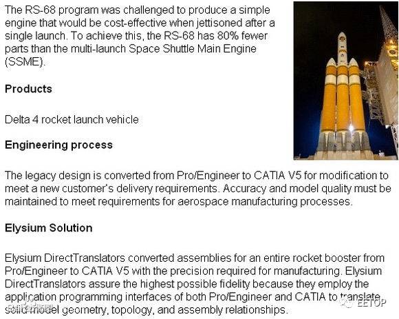 elysium为洛克达因的世界最大推力火箭引擎RS68项目团队提供高精确度高保真度的图形数距转换软件来应对复杂的实体几何模型 拓扑 装配关系