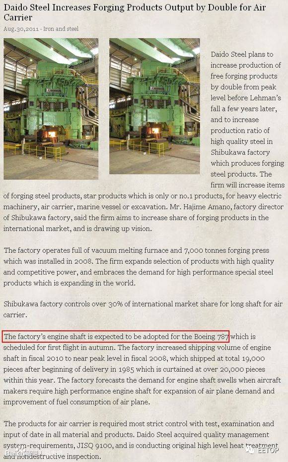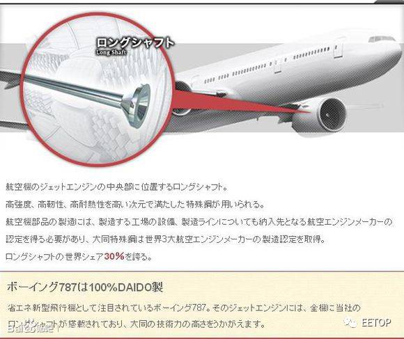世界最大特殊类钢材制造商——日本daido steel;由daido出品的商飞引擎用传动轴和船舶柴油引擎用开关阀分别占到了全球3成 6成份额,特别在传动轴市场是当之无愧的NO.1,历来波音空客旗下主力客机引擎之首选