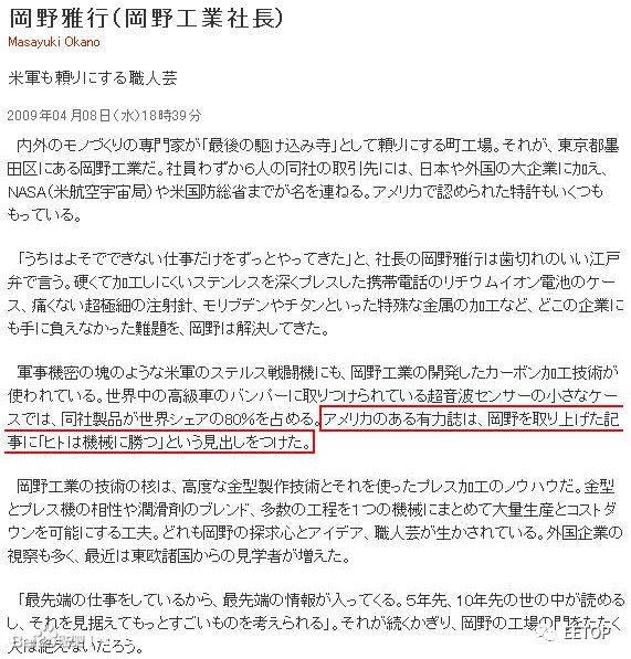 有这样一家企业,在民用领域拥有移动设备用锂电池不锈钢外壳的几乎100%份额;在军工领域是美帝隐型战机和NASA御用的炭素精加工技术提供者,美帝国防省激光反射器用抛物面天线指定供应商;在医疗领域利用自己世界第一的冲压技术成功帮助terumo将世界最细的针尖只有0.02mm的胰岛素注射针问世,从此使糖尿患者打针不再疼痛(今年1月已在中国上市)
