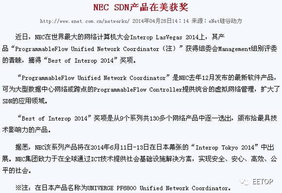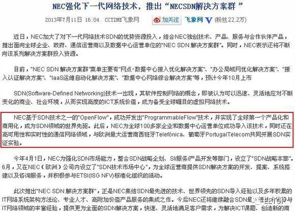 当下最新兴前沿的IT技术——software defined network(SDN-软件定义网络),SDN是一种基于openflow的新型网络架构,通过从路由器和交换机中的数据转发平面分离出一个集中开放式控制平面,同时将命令和逻辑规则发送回硬件数据平面,把原来负责控制的操作系统提炼为独立的网络操作系统来负责和硬件设备间的通信,在加强底层选择度与系统集成性并提升对网络和资源访问控制精细度的低成本平台下,得以让运营商或企业机构以更灵活的可编程化实现不同业务特性适配,使网络的流量控制和转发依赖于硬件设备的传统模式架构发生跟本性改变;SDN的最初概念由stanford大学研究组提出,目前以nec为首的日本IT企业在研发应用化阶段处于绝对的全球领跑位置。