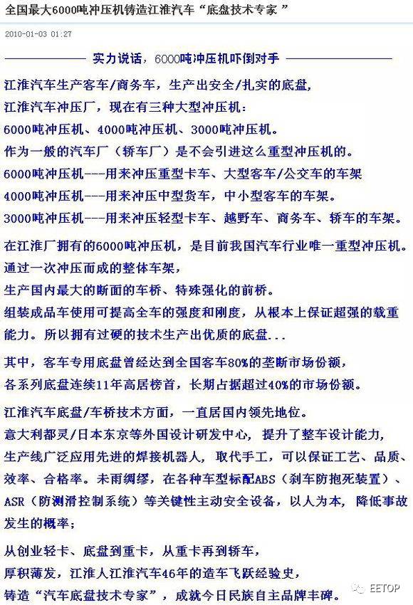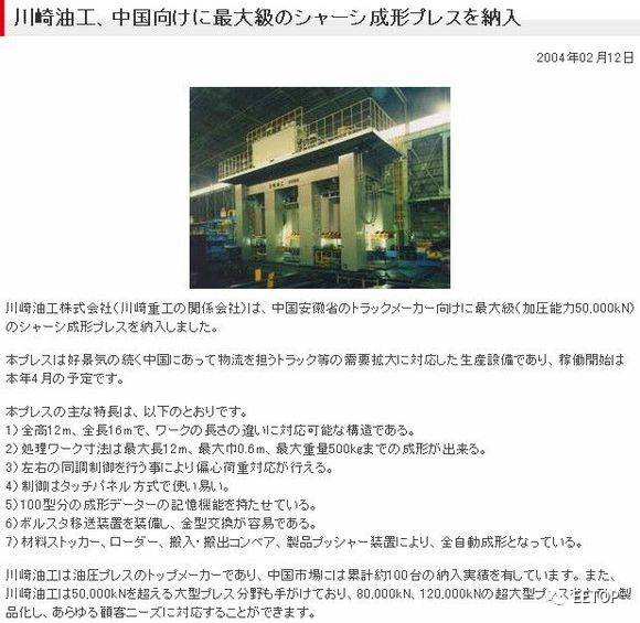 川崎重工旗下附属企业川崎油工自04-2013先后向中国第一大客车底盘生产商——安徽江淮汽车公司提供中国最大的(5000t/6000t)液压式伺服冲压机