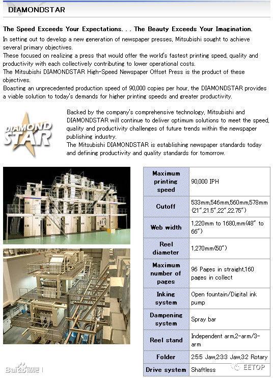 三菱重工与德国曼罗兰 高堡都有过向报社提供运转速度每小时90000cph(18万份/小时)的报纸用轮转胶印机的记录,不过在轮转印刷领域他们只能并列第2,岂今为止世界上最高速的倍幅报纸轮转胶印印刷机由日本TKS(东京机械)在2014年开发,印刷能力达到了每小时100000cph(20万份/小时)