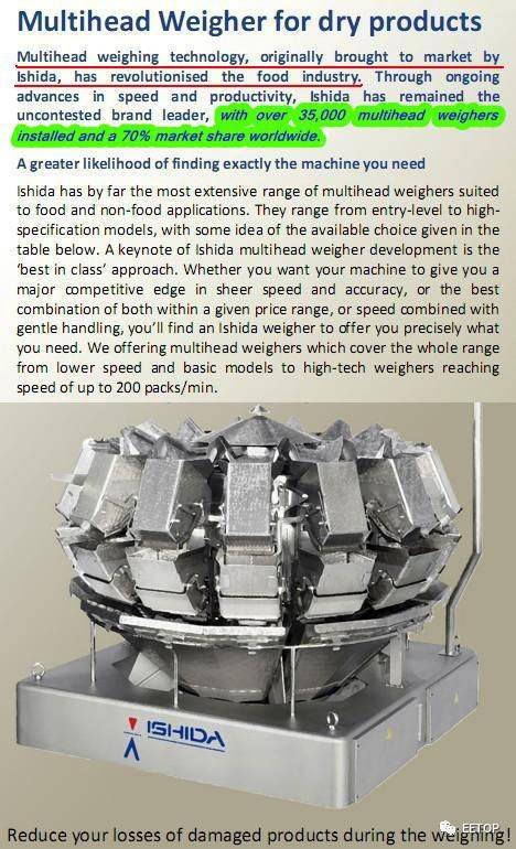 电脑多头秤的发明者,世界最大计量包装解决方案提供商——日本ishida(石田)如今在全球电脑多头组合秤量机市场占有7成份额