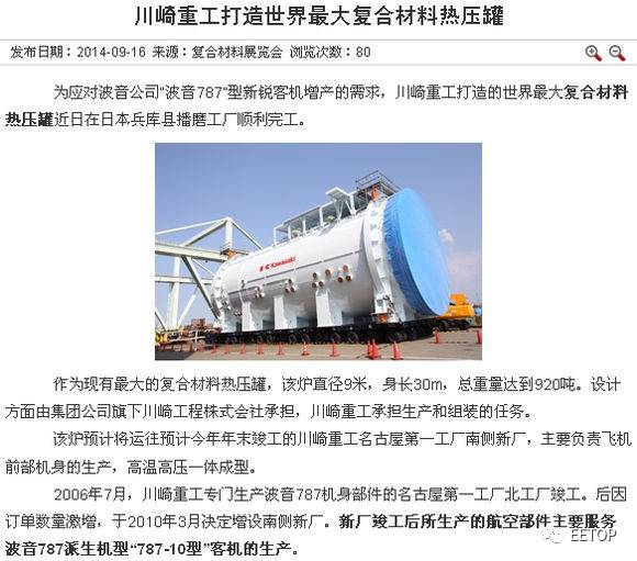 川崎重工为应对波音b787-9 b787-10增产和今后更大777x系列机型而最新设计打造的世界最大复合材料热压烧结炉(直径9m 长30m 重920t)已正式在名古屋第一工场投入使用;改进了加热工艺,能更稳定更均匀的通过高温高压将机身前胴体所需的积层碳纤维复合材料一体固化成型