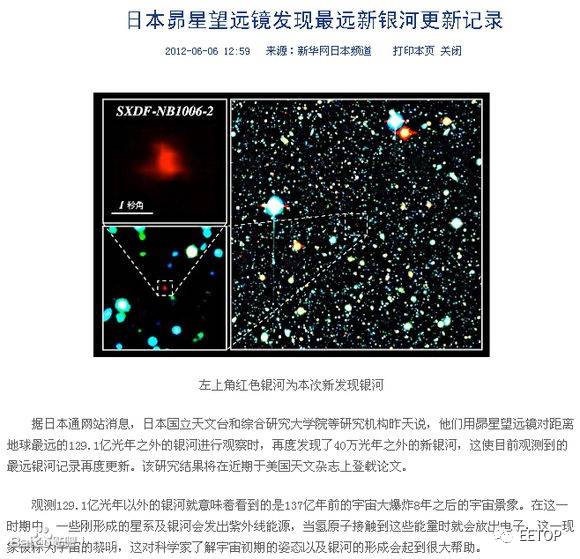 再举个例子: 世界第一行星探测能力的日本斯巴鲁subaru昴星为世界最大单一主镜片光学红外天文望远镜,在目前发现的距地球最遥远的10颗星系中有9个是科学家利用它发现的,其中包括最远的那颗,并在2012年打破了新银河的最远观测记录。