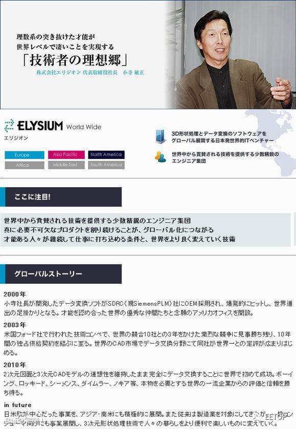 小企业有大实力——由来自静冈县滨松市不足70名员工的elysium开发的三维图形转换软件自本世纪初开始就已无时不刻的在幕后为各非盈利型机构 跨国公司(NASA 波音 达索 IBM autodesk 西门子 戴姆勒 宝马 福特)的主要项目提供支持