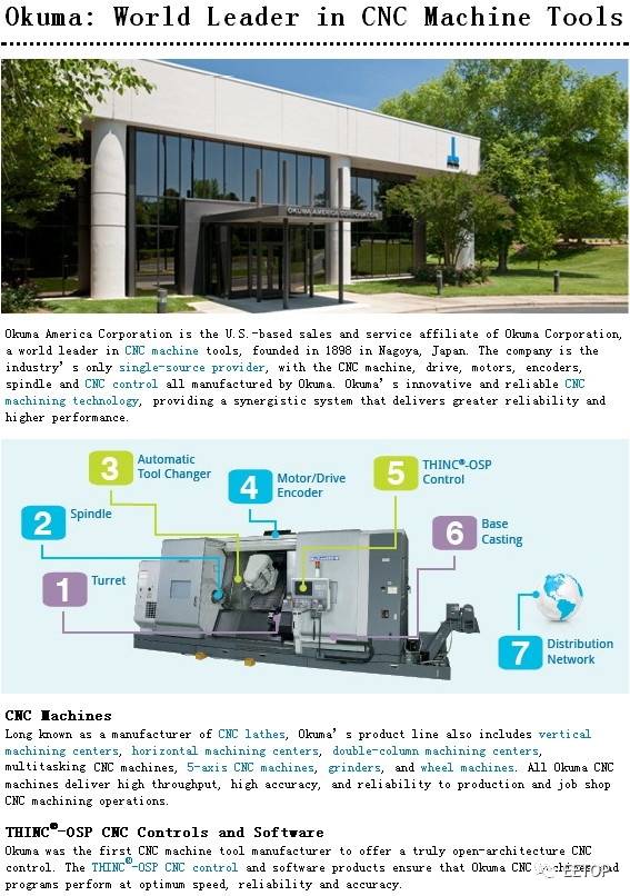 双主轴双刀塔车床的代表者——okuma(大隈株式会社);okuma最令人称赞的是这家公司是全球机床界中唯一的“全能型制造商”,几十年来一直坚持从核心部件(驱动器 编码器 马达 主轴等)到数控操作系统到终端,全部由自社设计开发完成,真正实现了软硬兼备