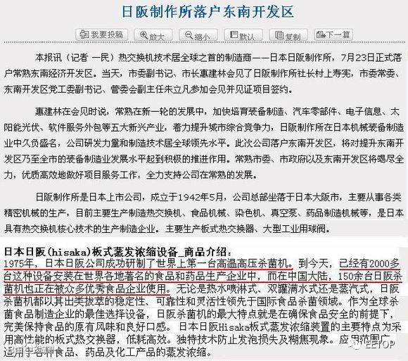 世界最大处理能力最高耐压的工业冷却板式热交换器——日阪制作所,份额方面则与瑞典阿法拉伐并列第一 另外日阪制作所利用热转换技术首创于全球的高温高压灭菌系统已被广泛应用在生产医疗输液器械 中草药制剂 家常菜食材 调味料 啤酒 软包装饮料等领域的杀菌工序环节中,市场占有率7成