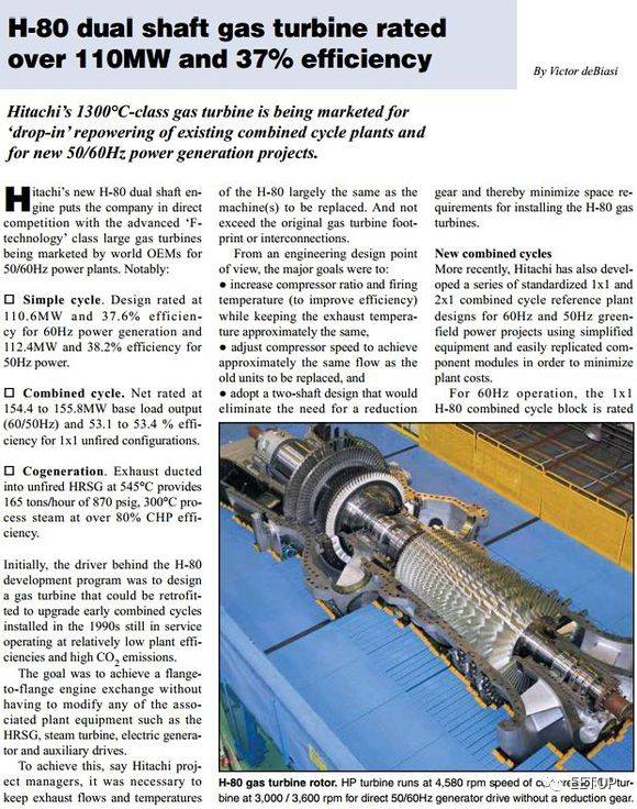 世界最大双轴燃气轮机,简单循环功率110mw+,联合循环功率154mw+——日立H80